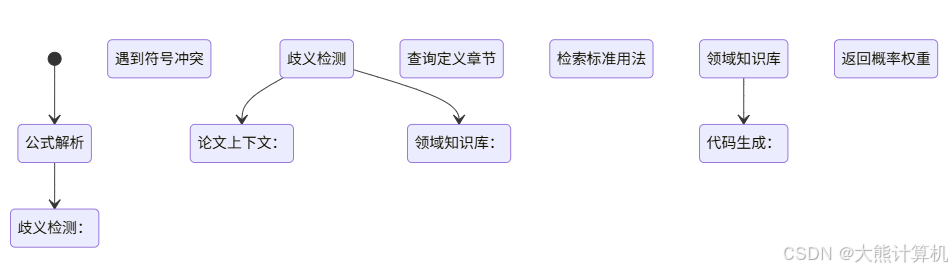图4:公式歧义处理状态机。当解析Agent检测到符号多义性时,触发跨文档检索流程,通过学术知识图谱消解歧义。橙色状态表示决策节点,绿色状态表示终结状态。