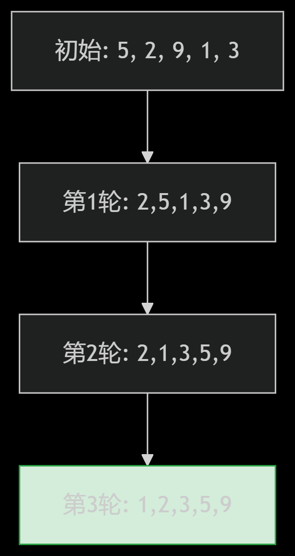 这里以冒泡排序(Bubble Sort)为例,因其直观易理解。 核心思想:重复比较相邻元素,将较大的数逐步“冒泡”到右侧。