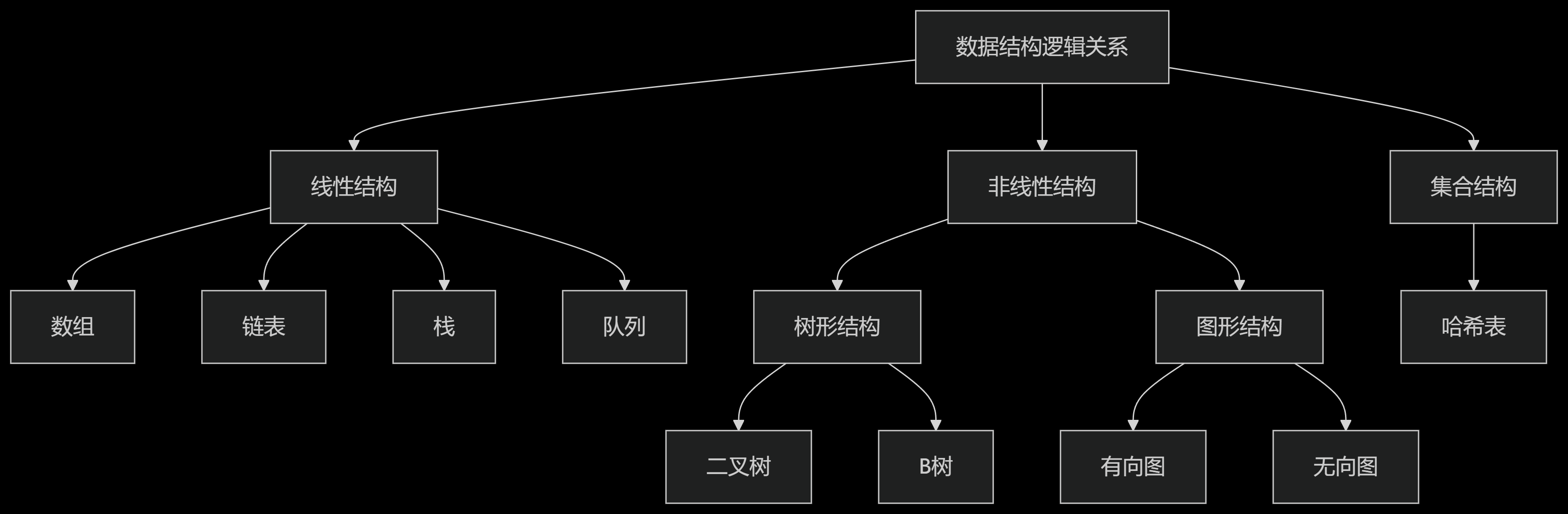 对于数据结构的逻辑关系,可以分为:线性结构:数据元素一对一关系(如数组、链表、栈、队列)、非线性结构包括:树形结构(一对多,如二叉树、B树)和图形结构(多对多,如有向图、无向图)、集合结构:仅存在归属关系,无明确顺序(如哈希表)