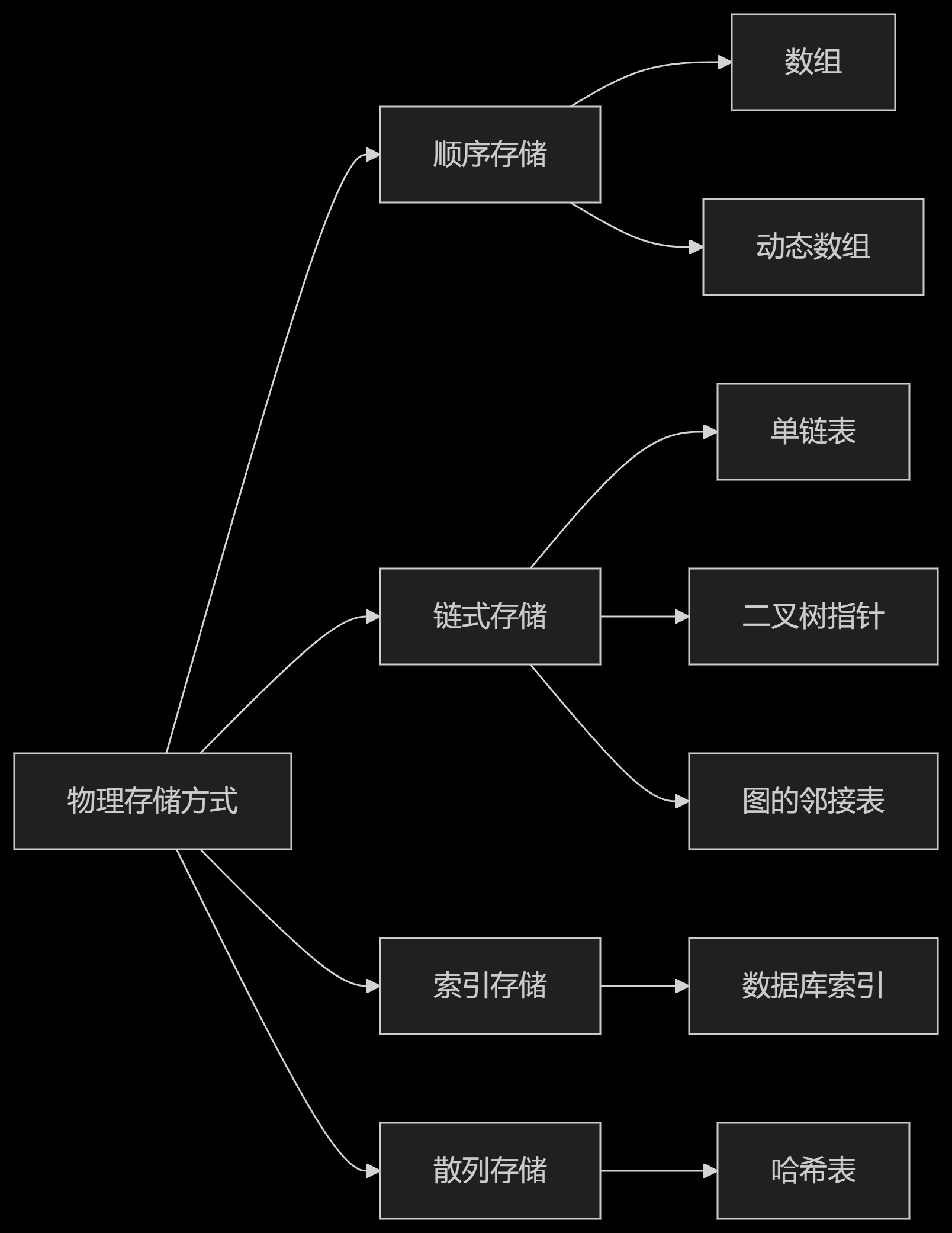数据的物理关系可以分为:顺序存储(Sequential):数据连续存放(如数组、动态数组)、链式存储(Linked):通过指针/引用连接离散内存块(如链表、树、图的邻接表)、索引存储(Indexed):额外建立索引表加速访问(如数据库索引)以及散列存储(Hashed):通过哈希函数映射存储位置(如哈希表)。