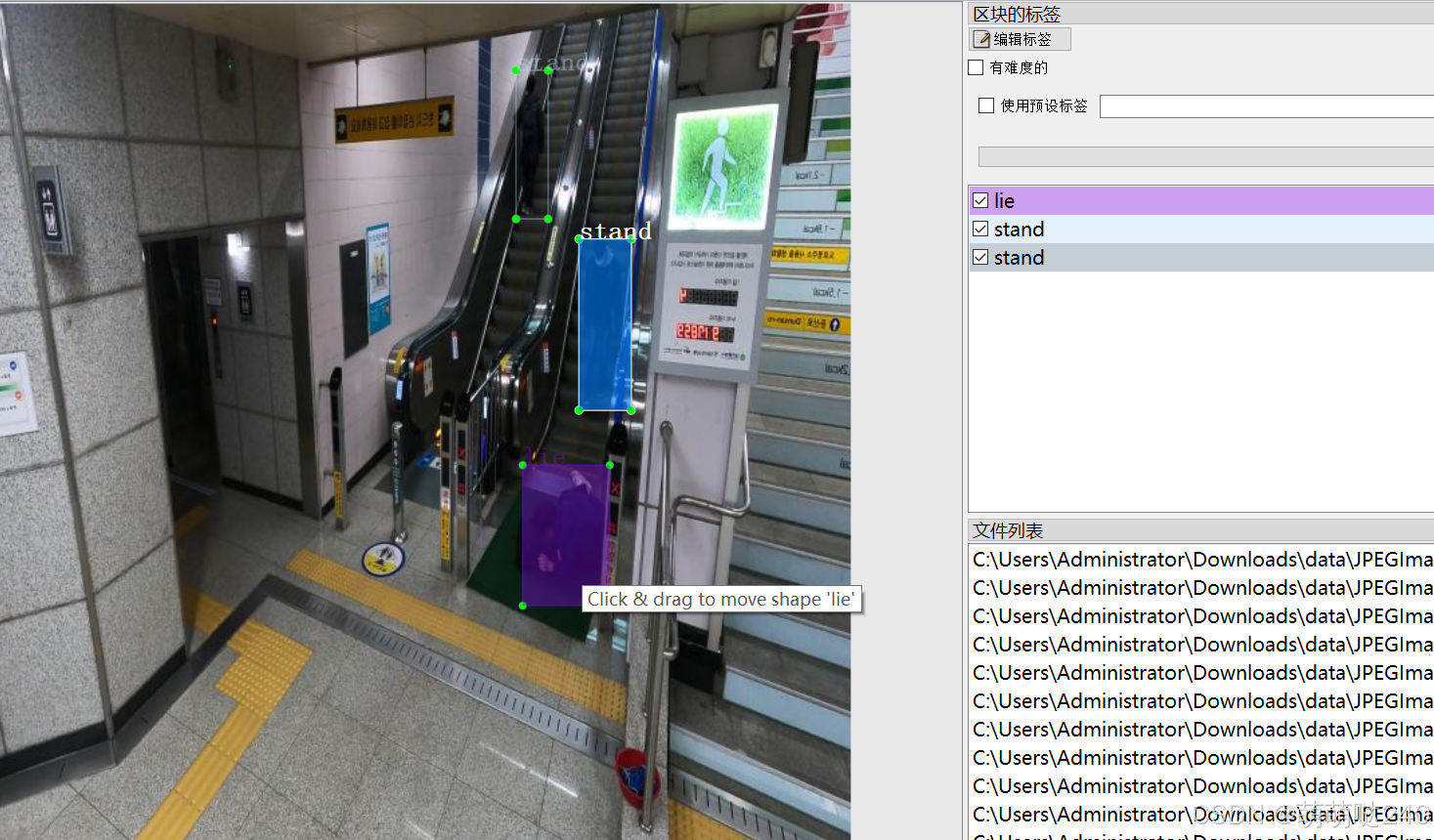 数据集格式:Pascal VOC格式+YOLO格式(不包含分割路径的txt文件,仅仅包含jpg图片以及对应的VOC格式xml文件和yolo格式txt文件) 图片数量(jpg文件个数):1529 标注数量(xml文件个数):1529 标注数量(txt文件个数):1529 标注类别数:3 标注类别名称:["lie","sit","stand"] 每个类别标注的框数: lie 框数 = 503 sit 框数 = 455 stand 框数 = 1270 总框数:2228 使用标注工具:labelImg 标注规则:对类别进行画矩形框 重要说明:暂无 特别声明:本数据集不对训练的模型或者权重文件精度作任何保证,数据集只提供准确且合理标注