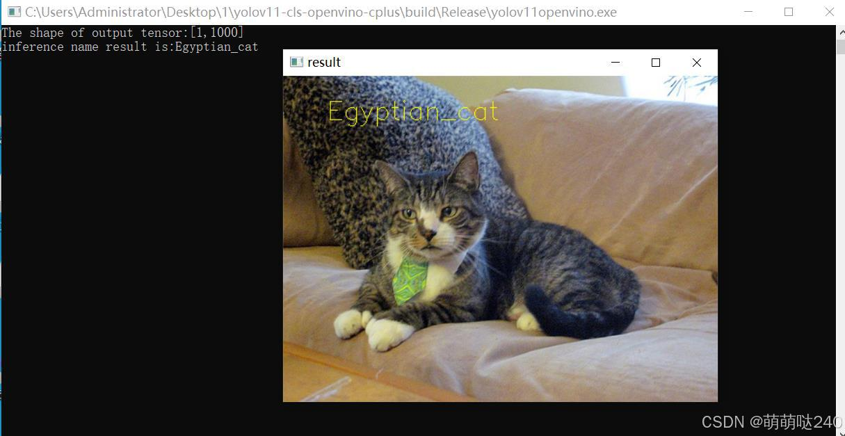 然后,使用CMake编译项目,并配置好项目的包含目录和库目录,确保能够正确链接到OpenVINO和OpenCV的库。编译完成后,运行示例程序进行图像分类。示例程序会加载转换后的IR模型,并对输入的图像进行分类。