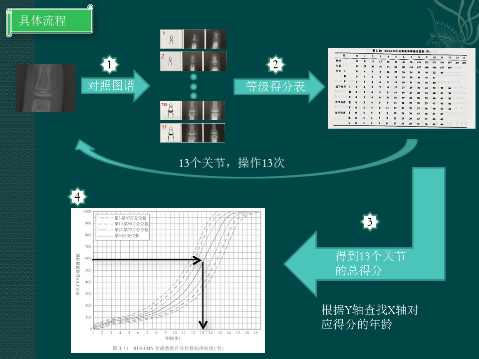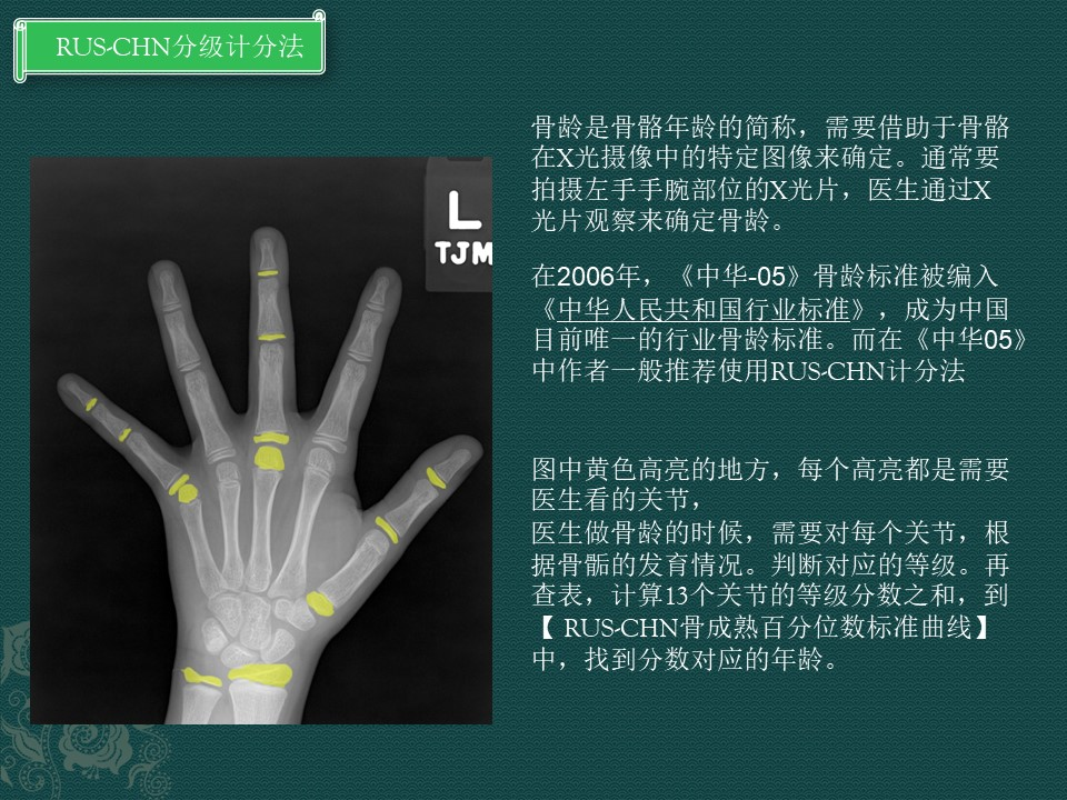 第三中节指骨骨骺分级4级,得9分;第五中节指骨骨骺分级4级,得11分;