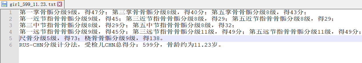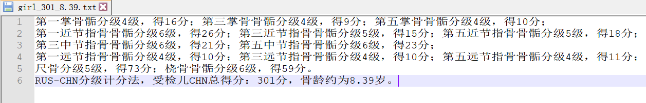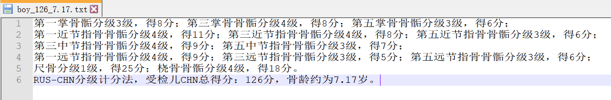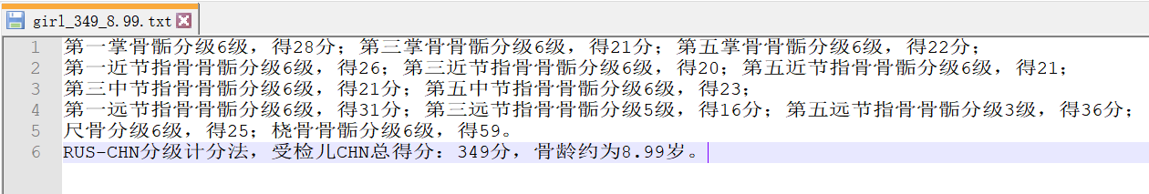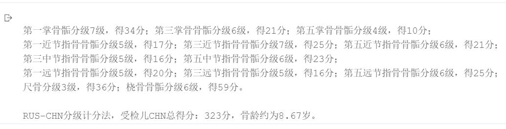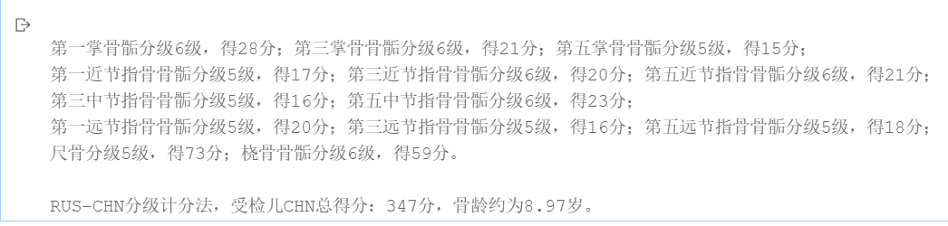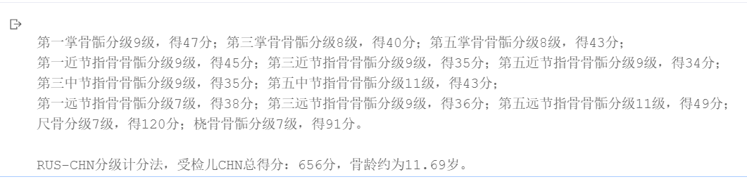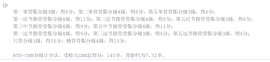 RUS-CHN分级计分法,受检儿CHN总得分:{}分,骨龄约为{}岁。""".format(