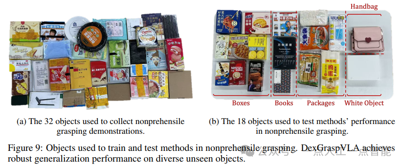 · 非预抓取操作扩展实验证明了框架的通用性。在32个扁平物体(盘子、盒子、书籍等)的1,029条示范数据上训练后,DexGraspVLA在18个未见物体上达到84.7%平均成功率(未见物体88.9%、未见背景86.1%、未见光照77.8%),显著优于基线。这一成功特别有意义,因为它展示了方法在完全不同的操作模式(先推动物体到桌边再抓取)上的适应能力,无需修改架构即实现了技能迁移,验证了框架设计的一般性。