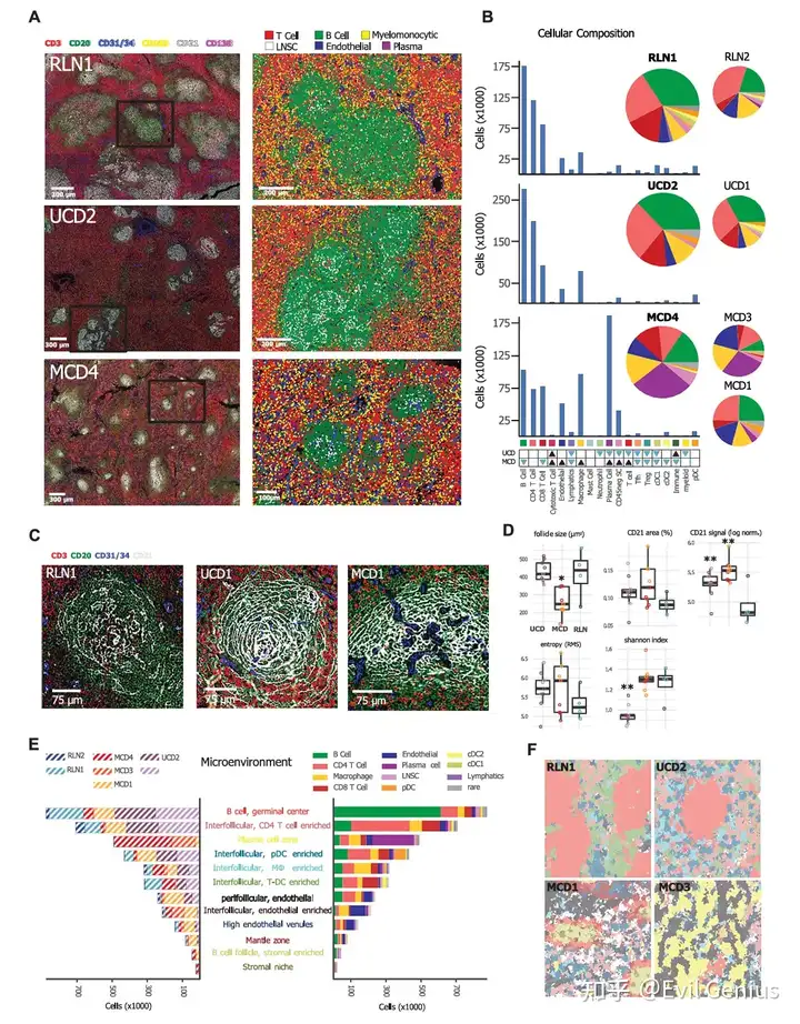 数量特征:UCD/MCD生发中心的CD45阴性DAPI+基质核(符合FDC特征)较RLN显著增多