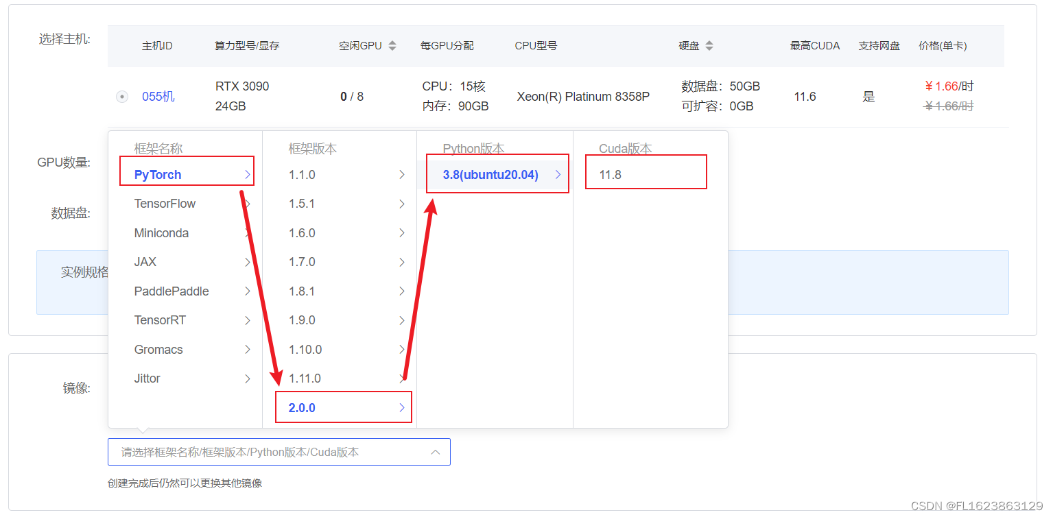 在 autodl 平台中租赁一个 3090 等 24G 显存的显卡机器,如下图所示镜像选择 PyTorch–>2.0.0–>3.8(ubuntu20.04)–>11.8
