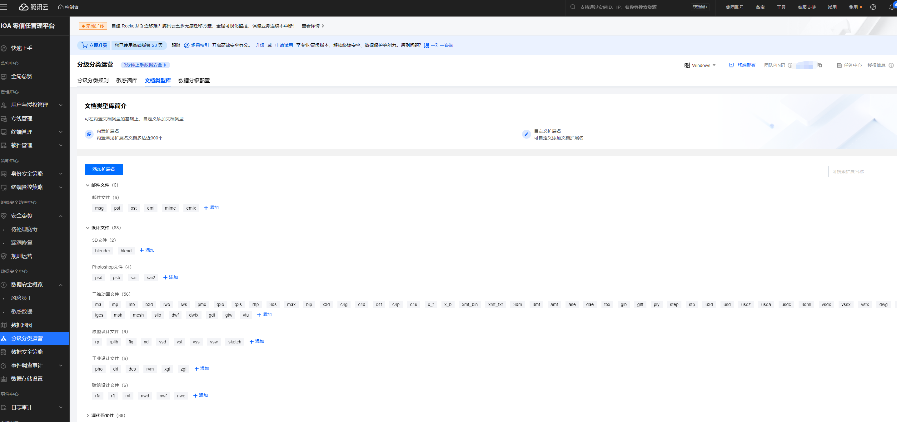 实际应用场景:比如对于设计院来说,最为核心的知识资产就是设计文件了。腾讯iOA的数据安全管理平台提供了非常详细的设计文件类型,还可以自定义手动添加。确保对文件数据资源泄露的有效监测。