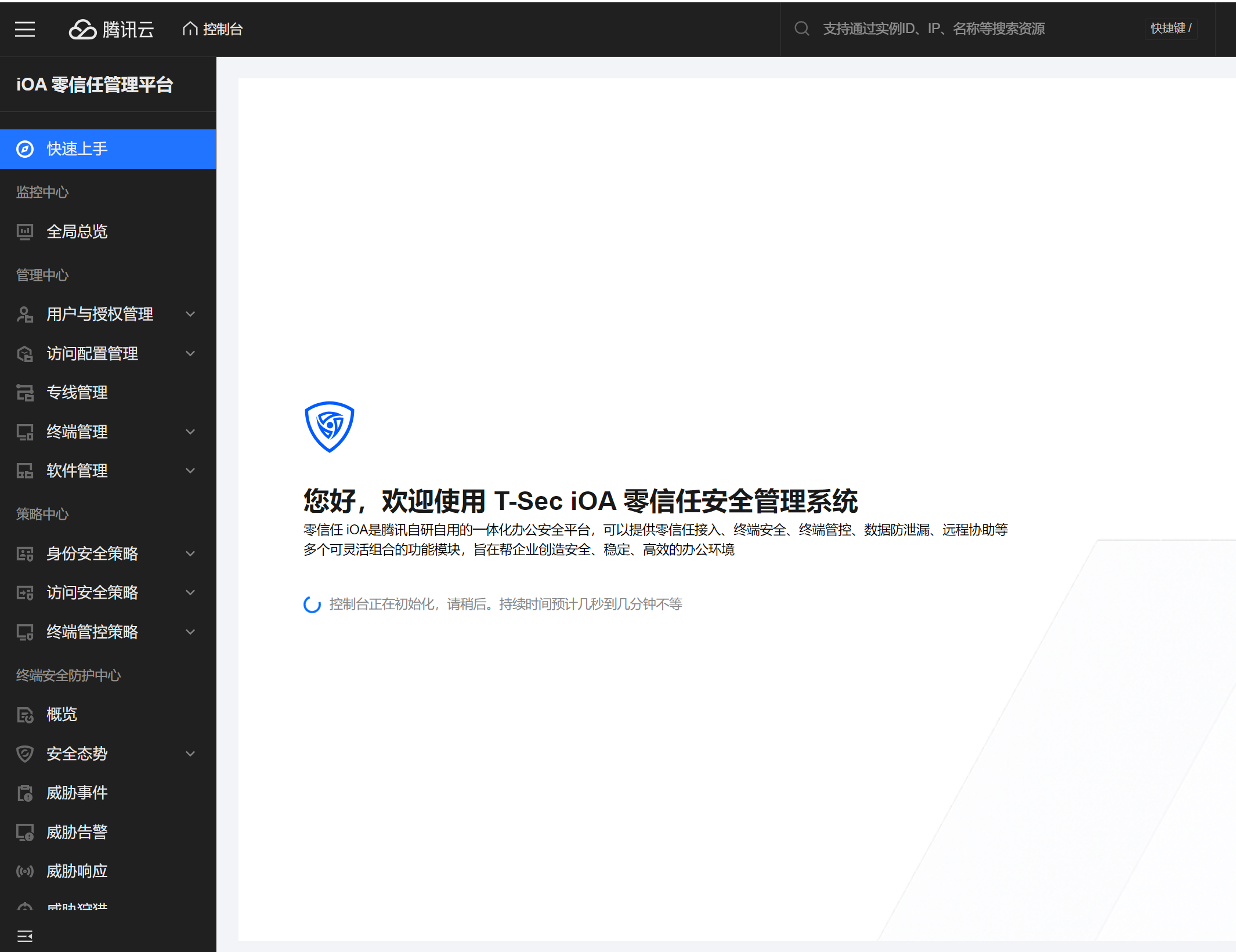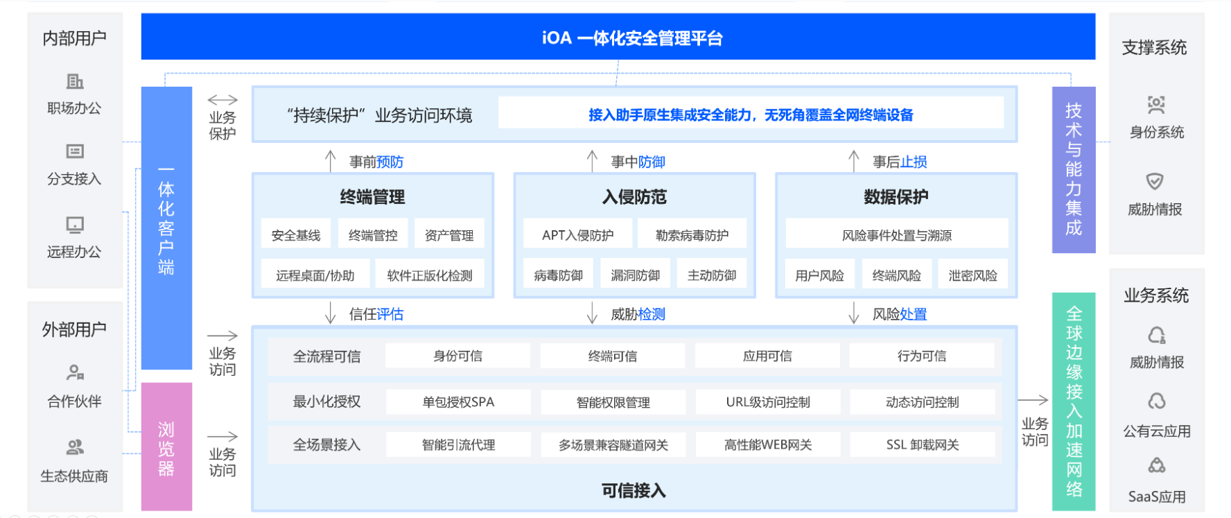 腾讯 iOA 是腾讯基于零信任安全理念,自主研发设计的一款终端安全产品。在产品架构设计时,参考了零信任 SDP(Software-Defined Perimeter,软件定义边界)的设计理念,由零信任控制中心、零信任安全网关、零信任客户端等组件构成,围绕可信接入、终端管理、入侵防范、数据保护等四个维度构建了多种安全能力,帮助用户解决不同场景下的终端安全问题。架构如下图所示: