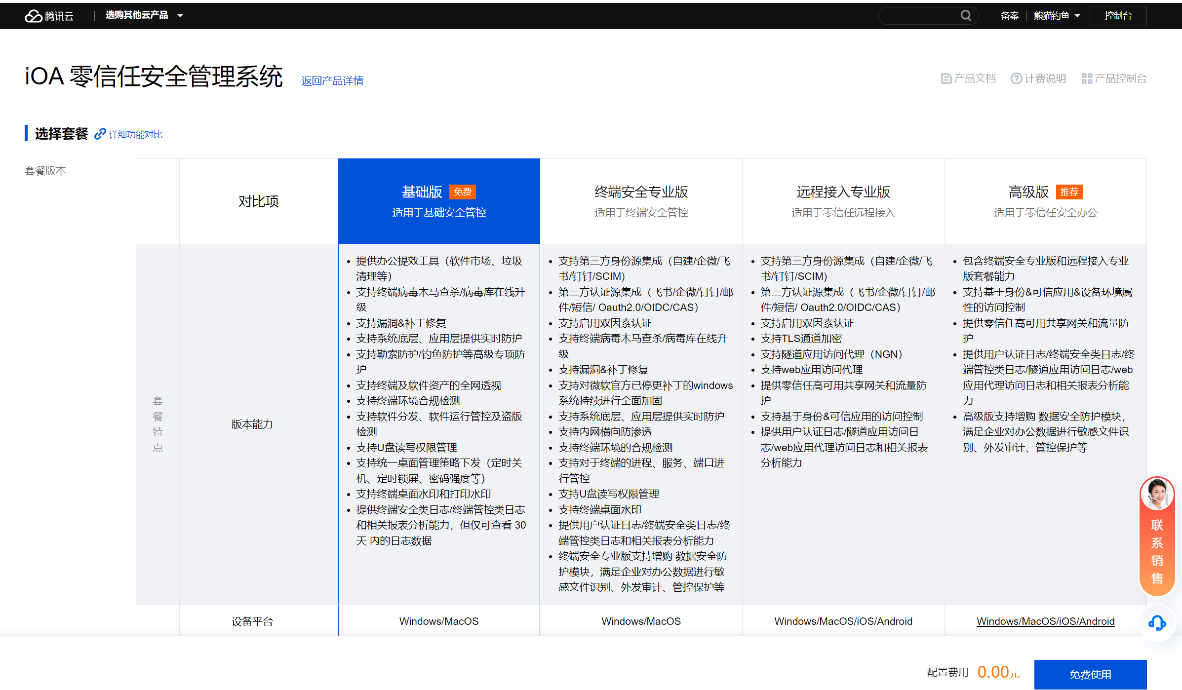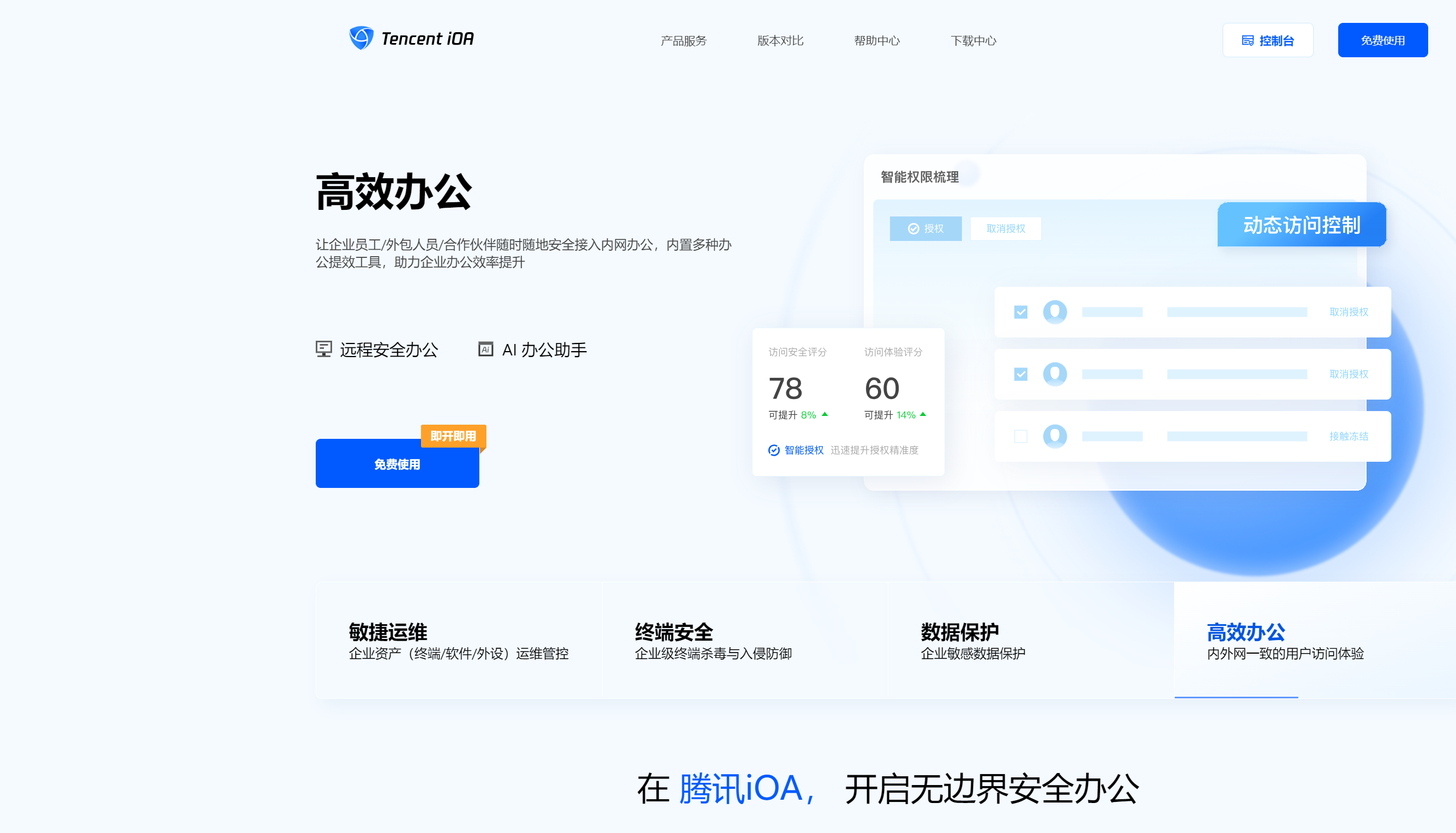 在Tencent iOA的官网主界面,我们直接选择免费使用。