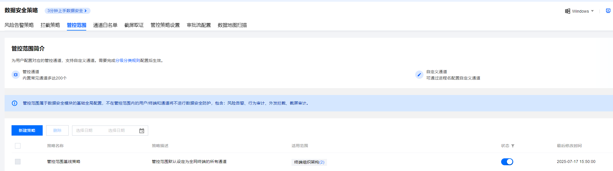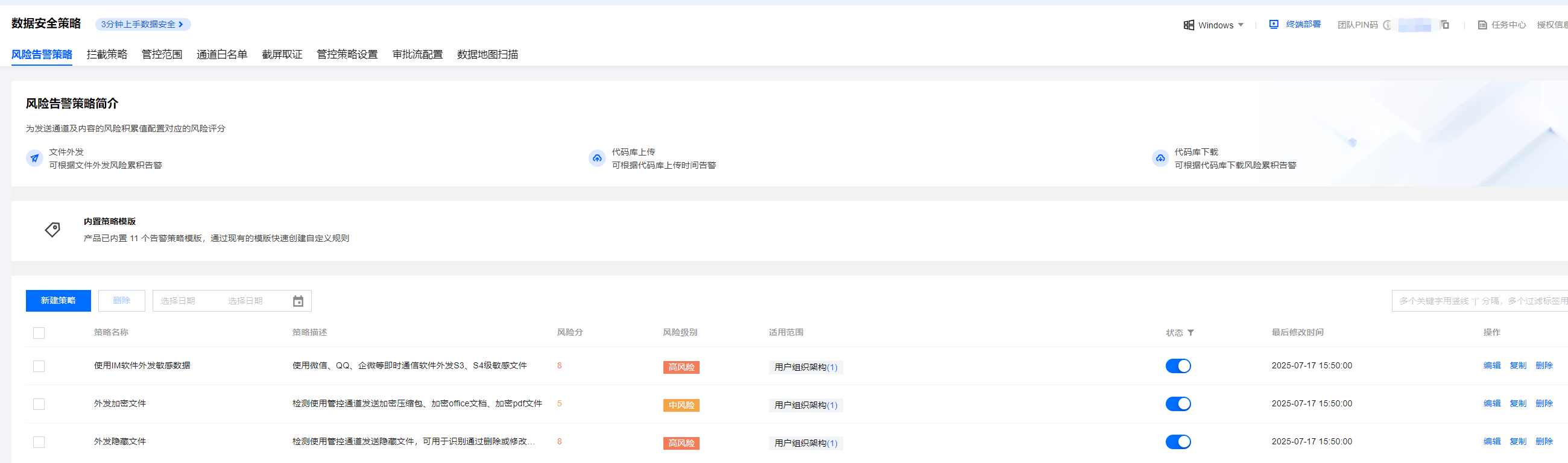 配置数据安全策略监控各种文件泄露的异常行为管理。