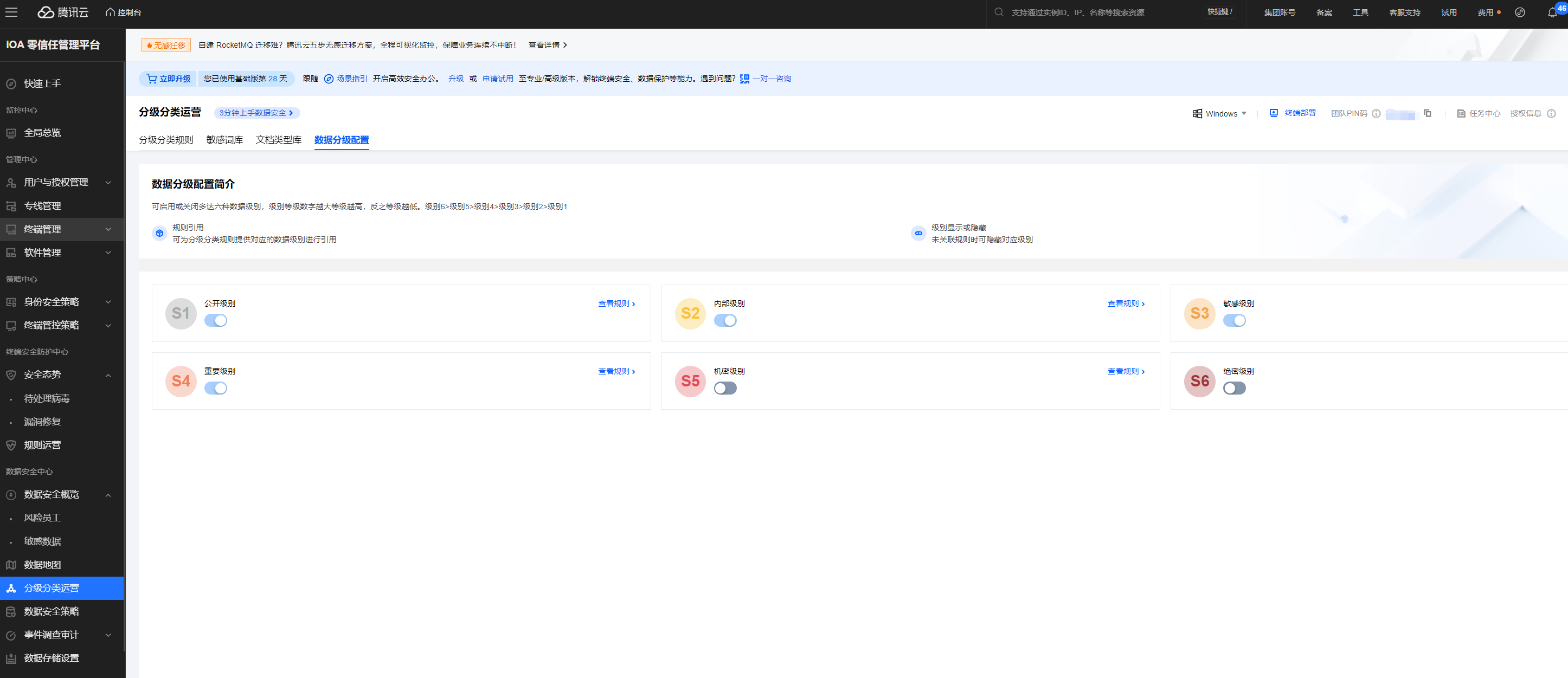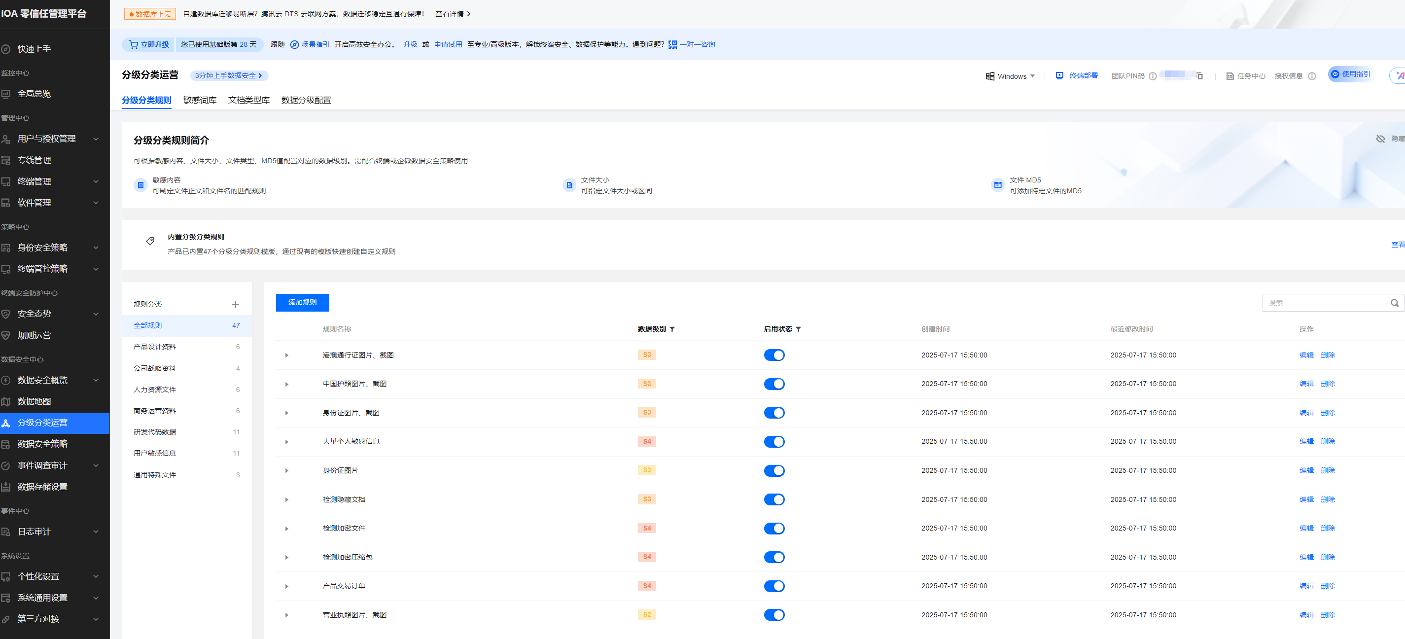 腾讯iOA基础版提供智能的数据分级分类和标签管理功能,帮助企业对数据进行精细化分类,为后续的管理和利用奠定基础。