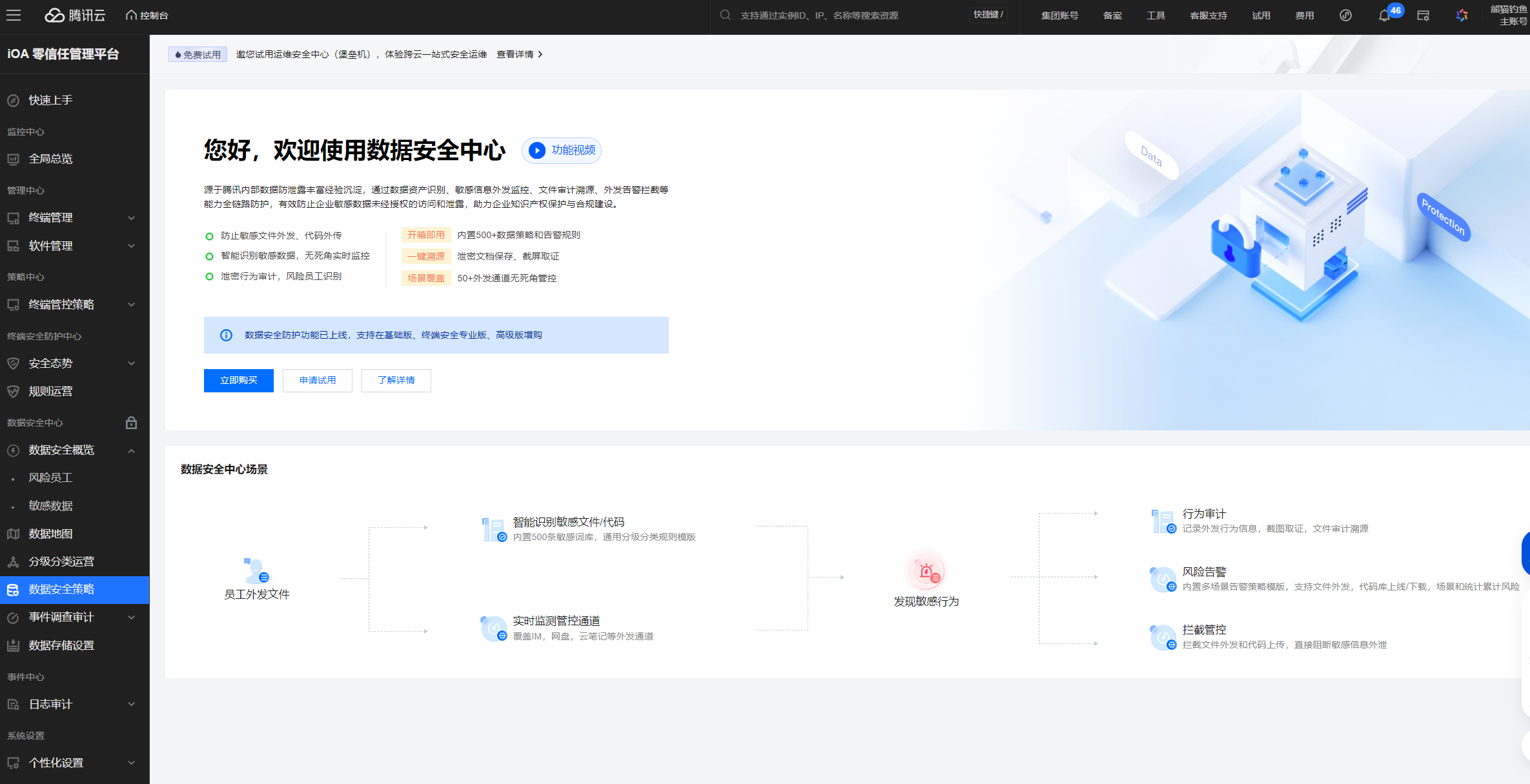 数据安全是企业数据资产管理的核心环节,腾讯iOA基础版提供了全域防护的数据安全保护体系,覆盖资产识别、外发监控、审计溯源、告警拦截、风险分析等全链路,有效防止企业敏感数据未经授权的访问和泄露。