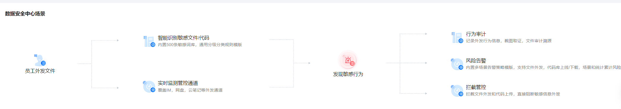 数据防护能力 | 通常需要集成多个工具,防护不全面 | 内置全链路防护体系,覆盖资产识别、外发监控、审计溯源、告警拦截、风险分析 |