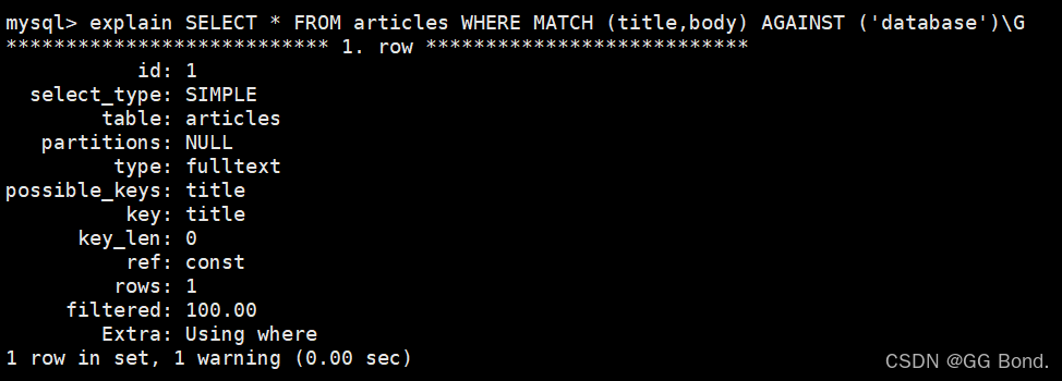 explain SELECT * FROM articles WHERE MATCH (title,body) AGAINST ('database')\G