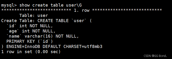 mysql> insert into user (id, age, name) values(3, 18, '杨过');
