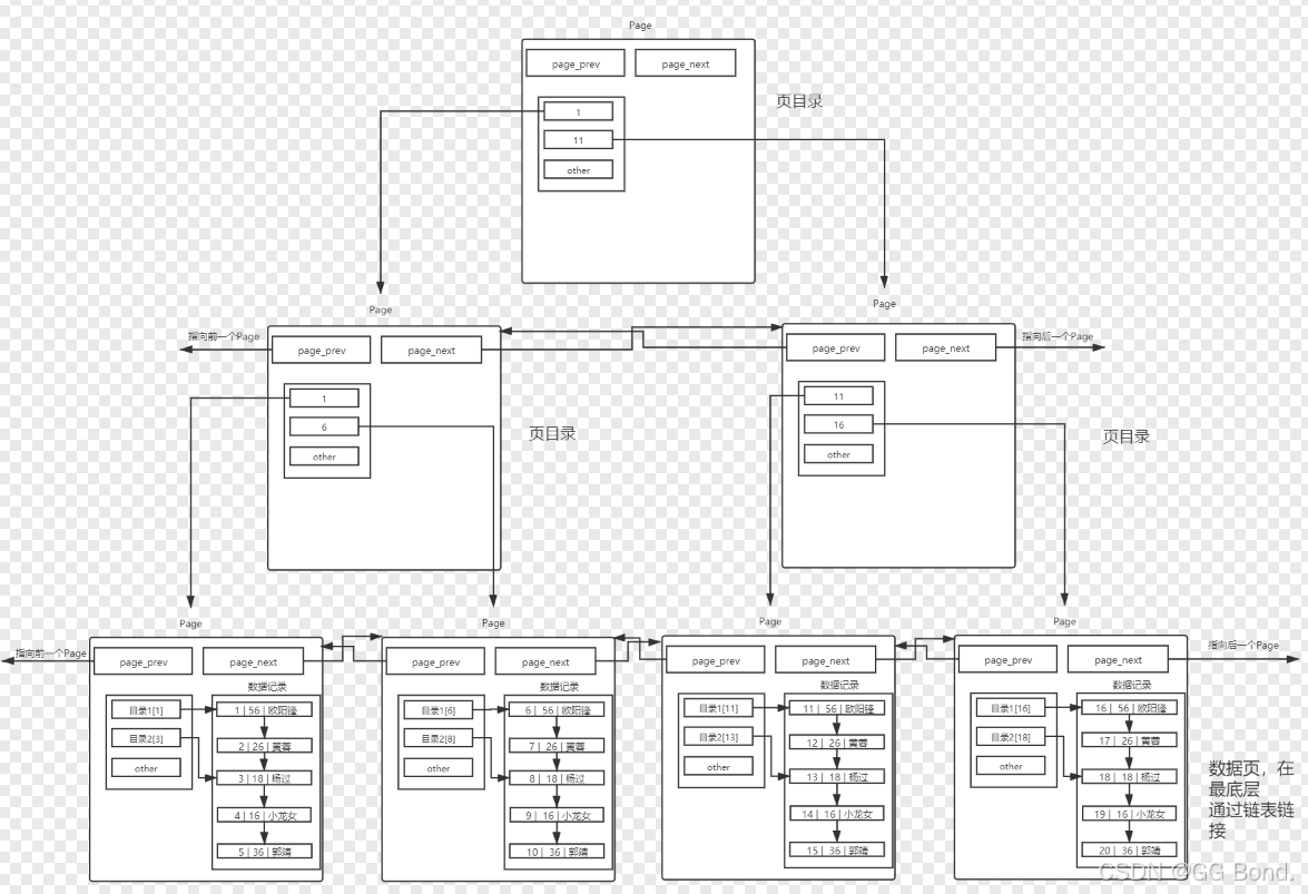 存在一个目录页来管理页目录,目录页中的数据存放的就是指向的那一页中最小的数据。有数据,就可通过比较,找到该访问那个Page,进而通过指针,找到下一个Page。