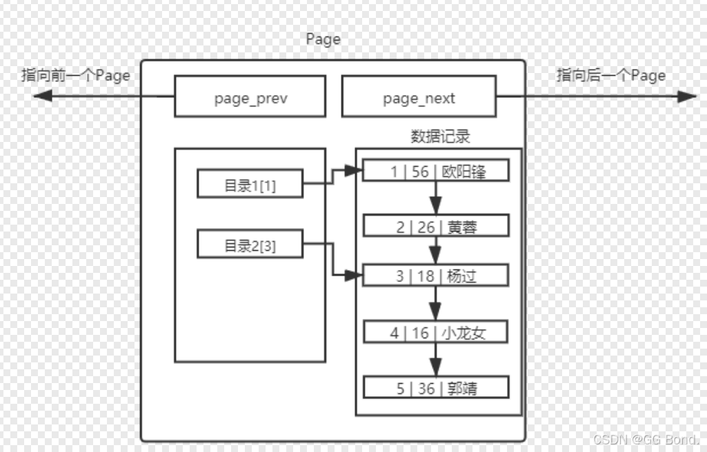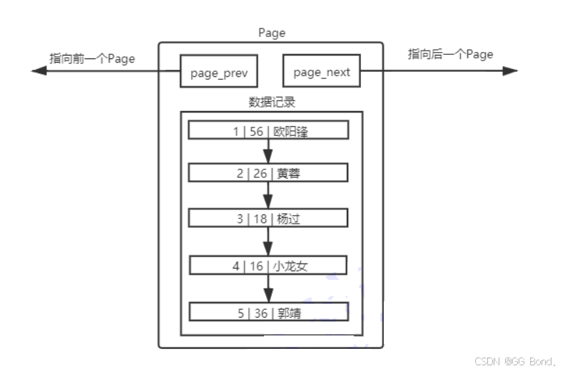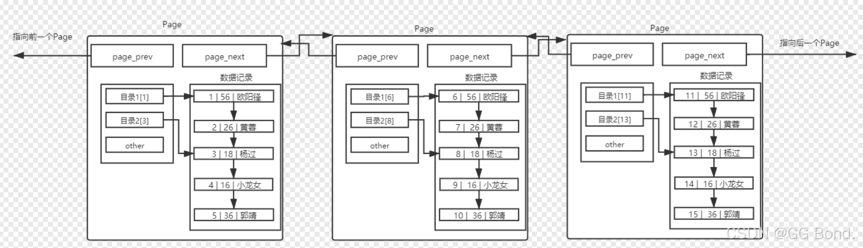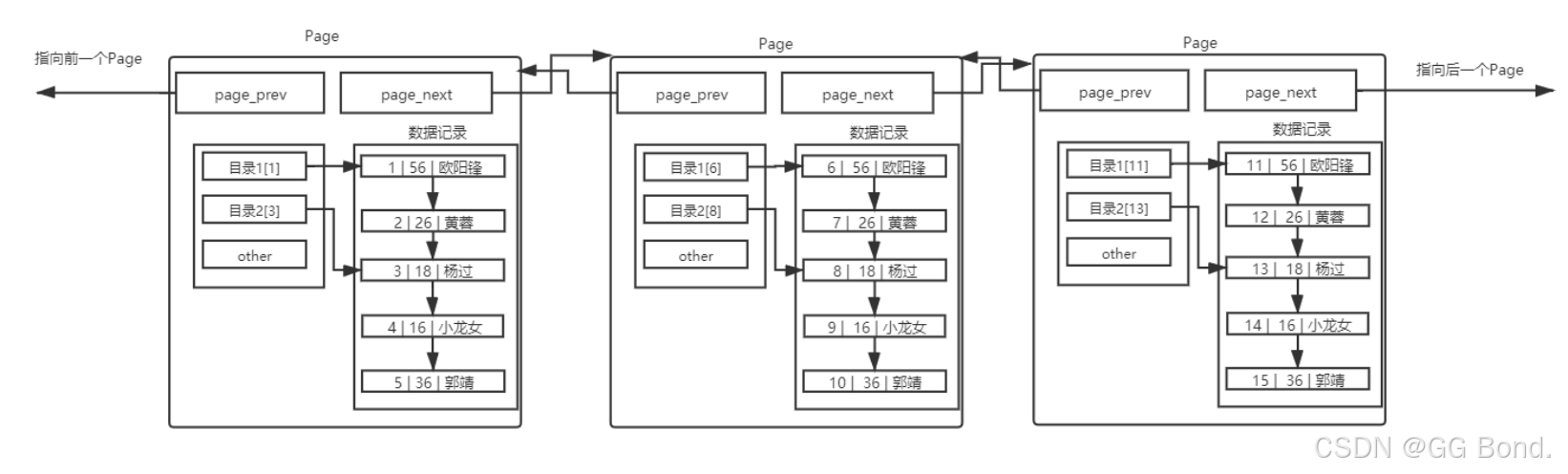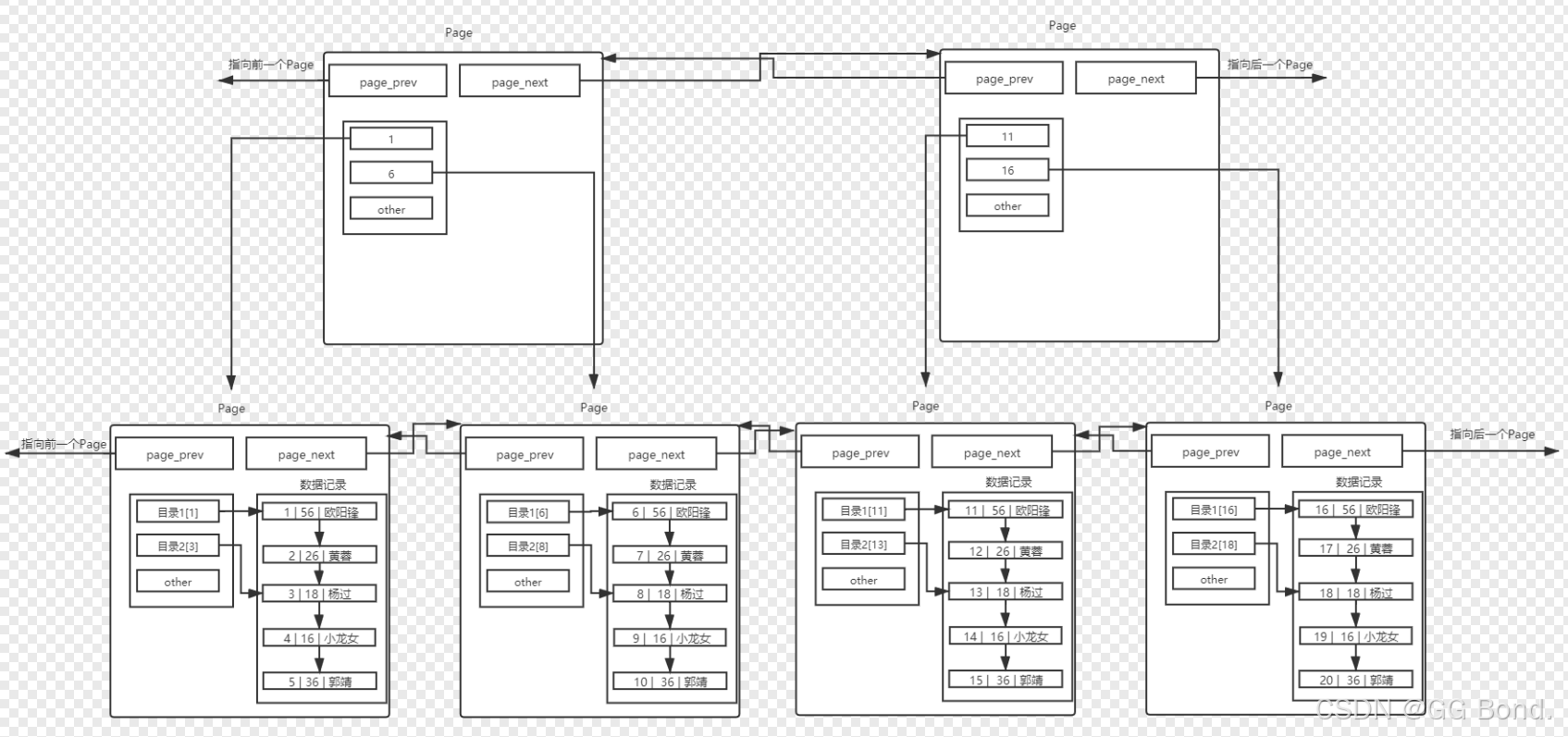 如上,就是page的基本构成,page中的数据是以链表的形式存放的,同时page自身也是通过链表的形式进行组织的,它里面有两个指针分别指向前一个page和后一个page