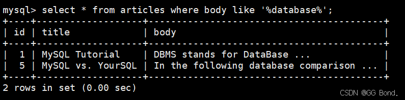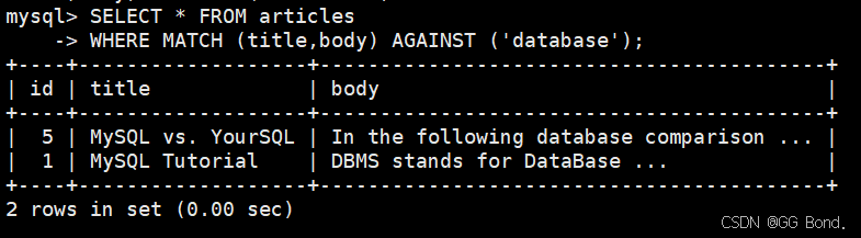-> WHERE MATCH (title,body) AGAINST ('database');