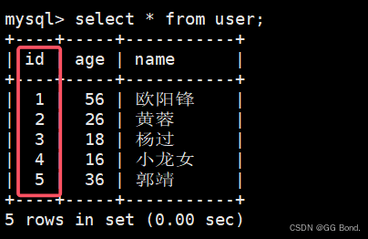 mysql> insert into user (id, age, name) values(5, 36, '郭靖');