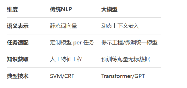 示例:传统NER需训练独立模型,而大模型通过Few-Shot提示即可实现: “文本:马云曾任阿里巴巴CEO。抽取实体:__” → 模型输出:{"人物": "马云", "公司": "阿里巴巴"}