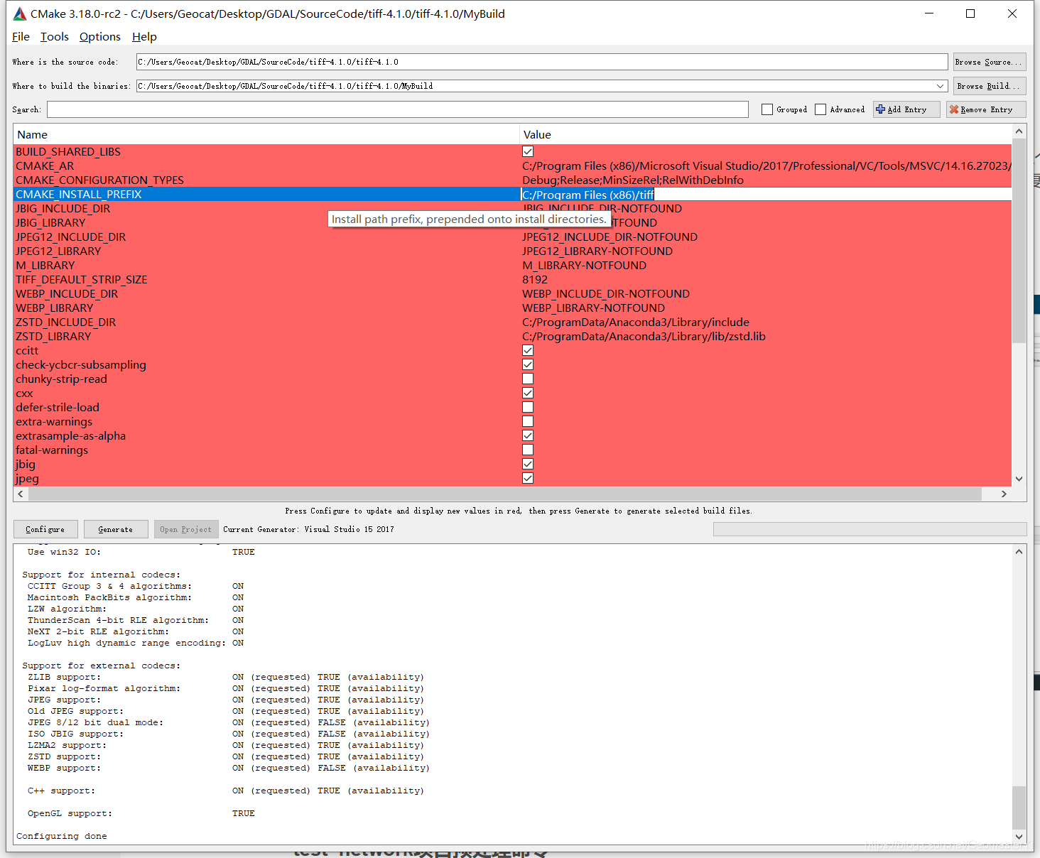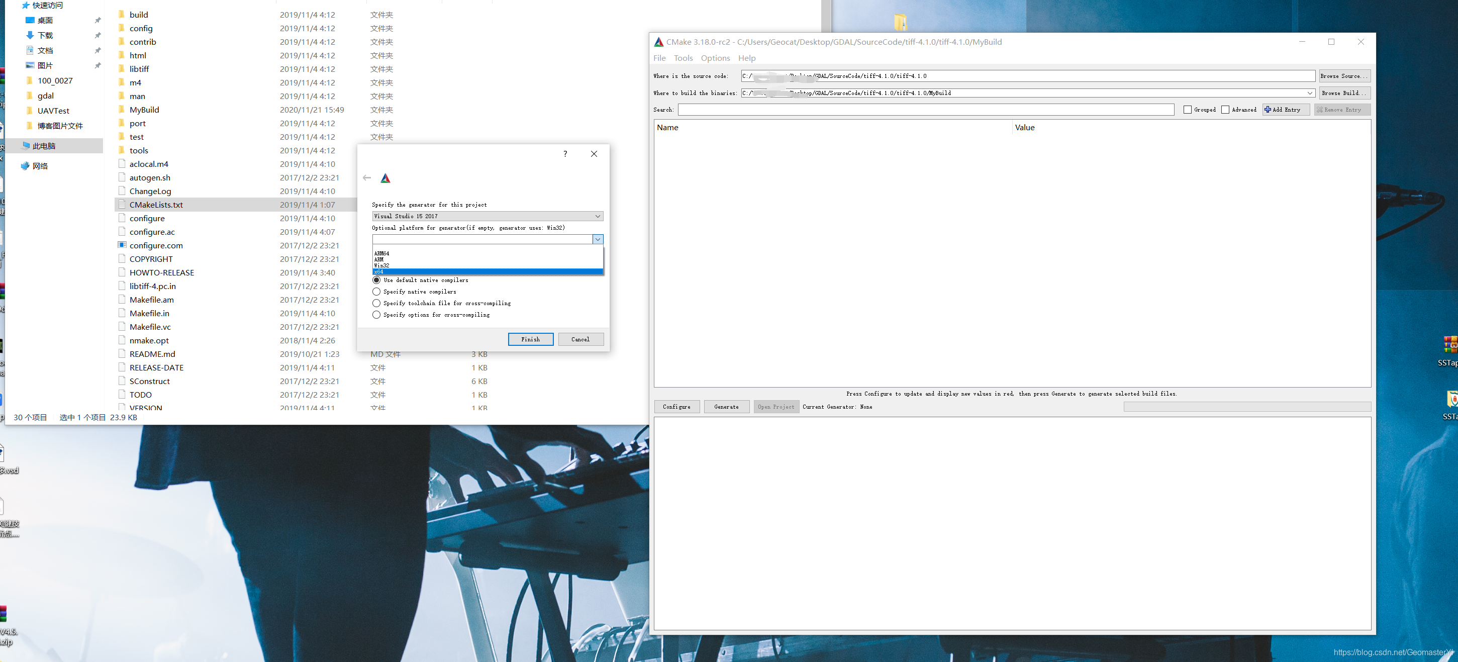 编译TIFF 下载tiff的源码并解压,打开cmake软件,将tiff源码目录下的cmakelist.txt文件拖到cmake中,如下:
