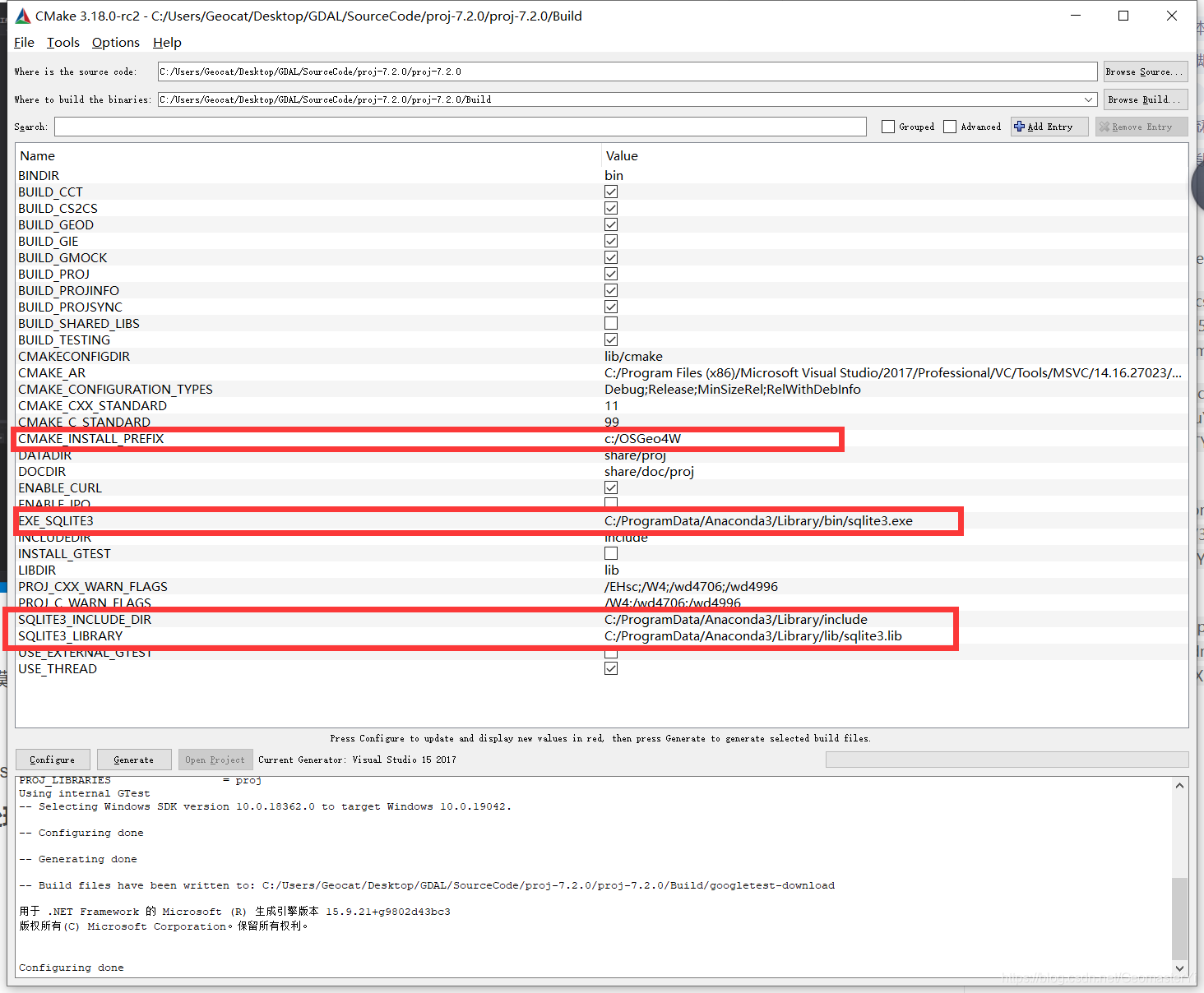 这一步的路径是你最后选择install之后,lib库等的安装位置。cmake_install_prefix就是cmake的安装前缀,即安装路径。 修改了之后点击generate按钮,会生成相应的项目解决方案。如下所示: