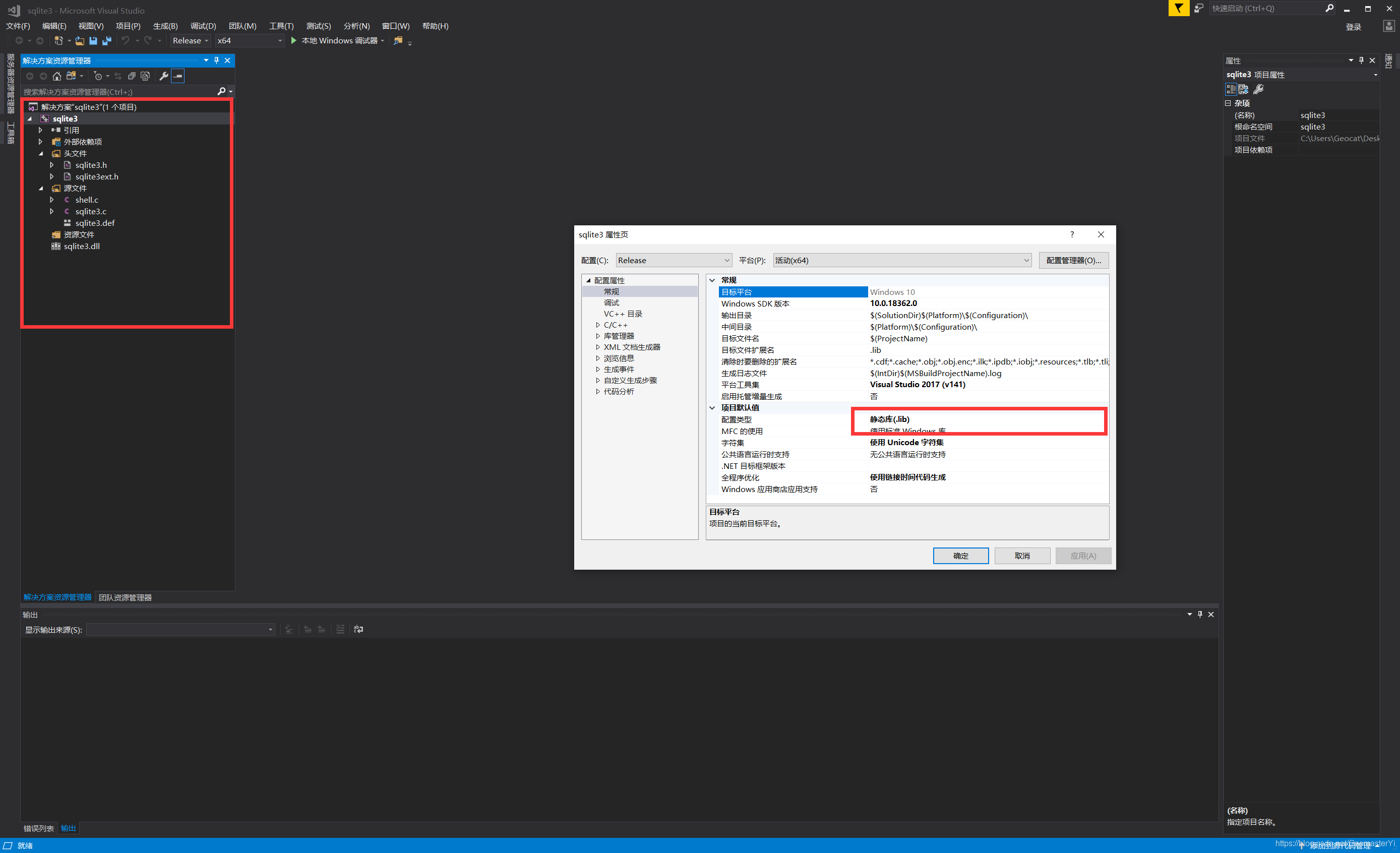编译lib库,Debug和Release版本都要; 编译.exe的可执行文件,需要的话debug和release版本; 编译.dll库,这个需要添加那个sqlite3.def文件。 项目中修改编译的类型的就再项目属性界面的红框处修改,上面每一个都要编译一次。 编译完了之后,新建一个sqlite3的文件夹(任何你想放的地方),在这个文件夹下新建bin、lib、include三个文件夹,将编译生成的.exe和.dll复制到新文件夹的bin目录下,将sqlite3的源码复制到include文件夹下,将生成的.lib文件复制到lib文件夹下。