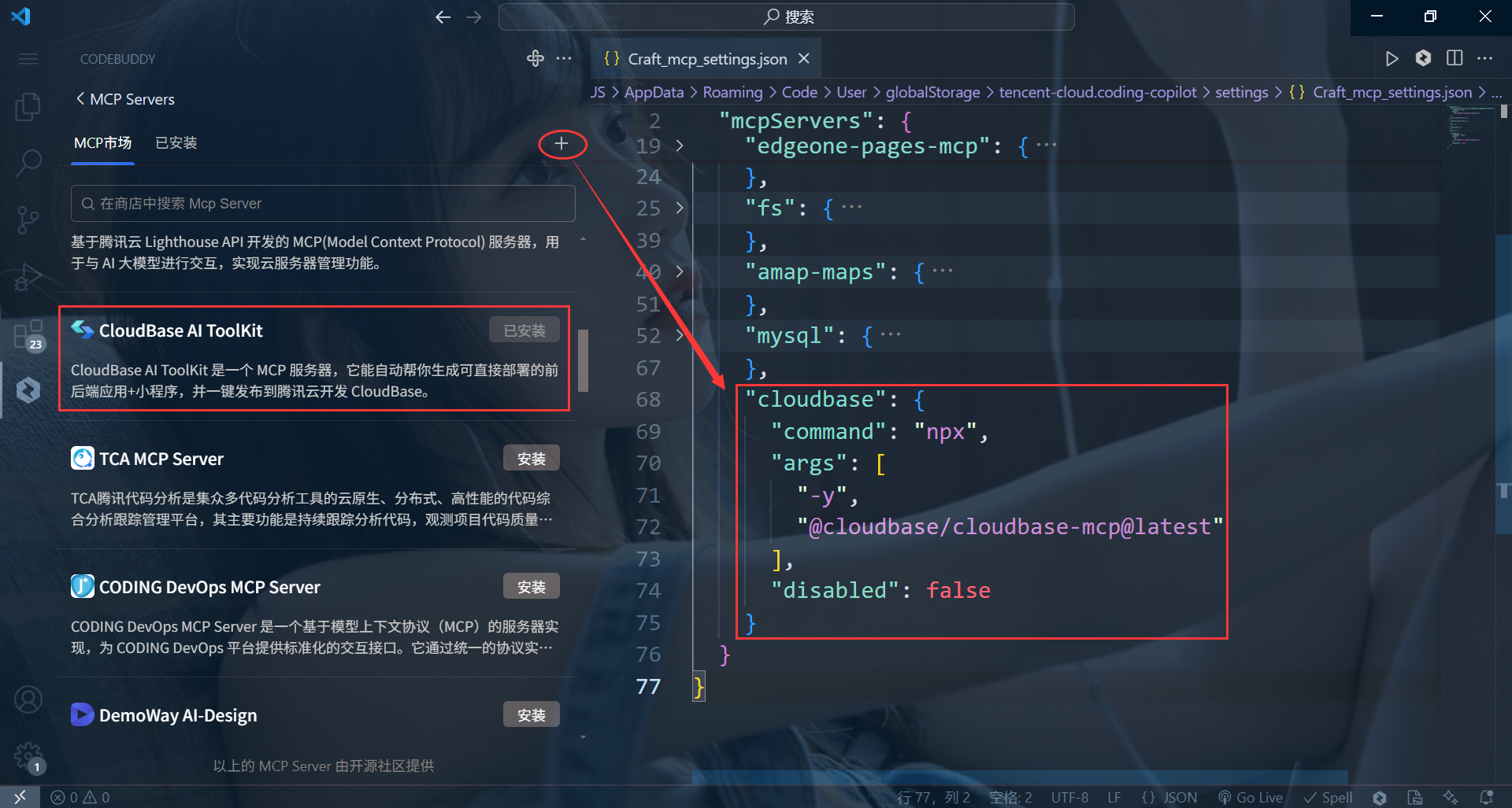 可以在MCP市场中直接搜索安装CloudBase,也可在json文件中配置。