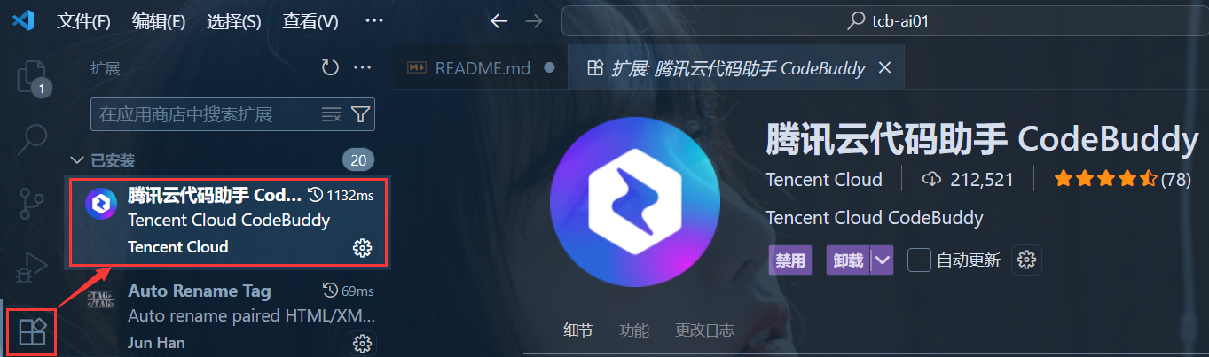 在VSCode中安装CodeBuddy插件,并登录CodeBuddy。