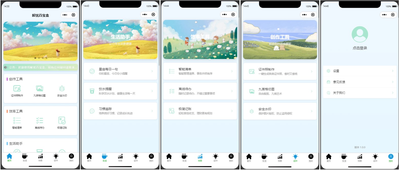 1、小程序的底部导航栏分别是首页、生活、效率、创作、我的。 2、首页包括banner轮播区、公告栏和功能分类区。 3、功能分类区采用网格布局展示所有功能。包括: 创作工具:证件照制作、九宫格切图、安全水印。 效率工具:智能清单、离线待办、极简记账。 生活助手:星座每日一句、饮水提醒、习惯追踪。 4、整体样式设计要美观好看。