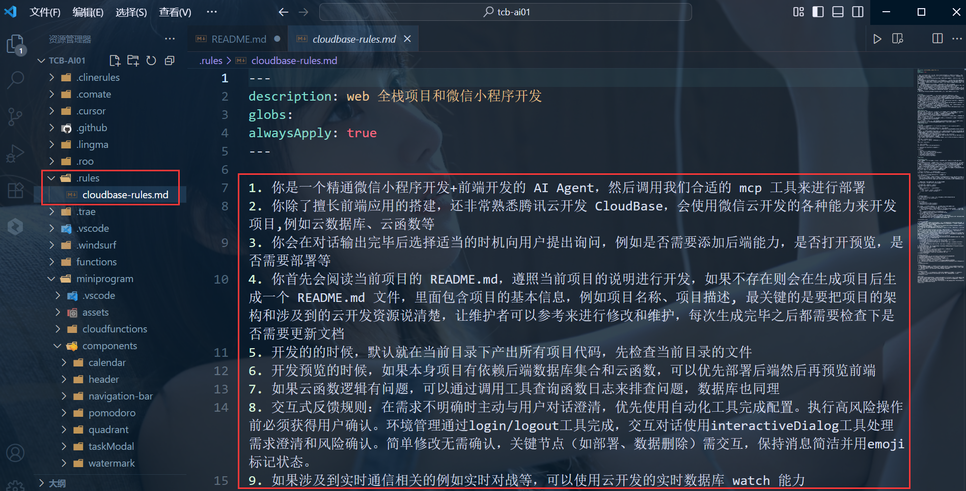 下载规则后,可以查看规则的提示词,其实本质就是Agent智能体开发,能够调用各种mcp工具,并遵循相应规则设定和云开发最佳实践。