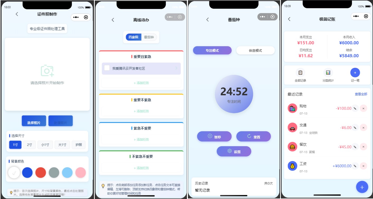 最后,我选择了9个功能模块,分别是:证件照制作、九宫格切图、安全水印、智能清单、离线待办、极简记账、星座每日一句、饮水提醒、习惯追踪。这些相对而言都比较容易实现,符合我这个工具类小程序1.0版本上线的期望。