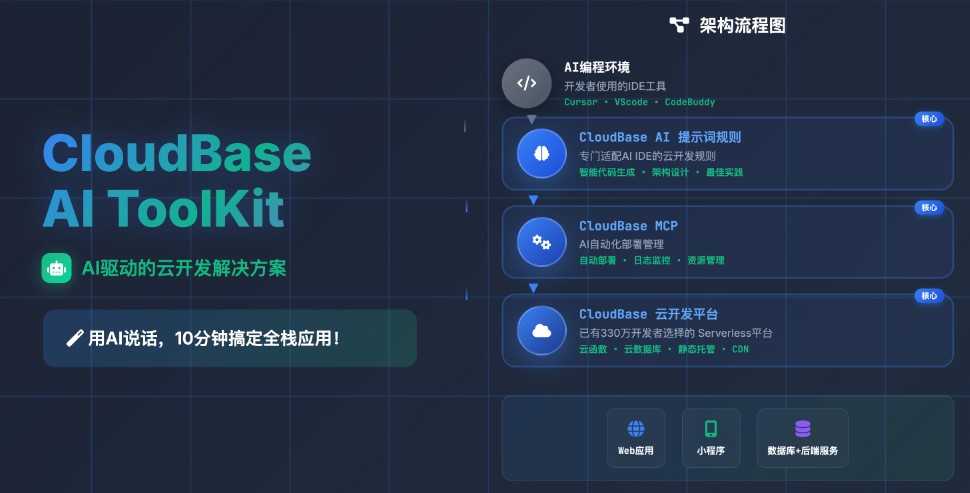 CloudBase AI ToolKit是腾讯云开发CloudBase的新能力,它无缝适配主流 AI 编程工具如Cursor、CodeBuddy、Trae、WinSurf等,能自动帮你生成可直接部署的前后端应用+小程序,并一键发布到腾讯云开发。