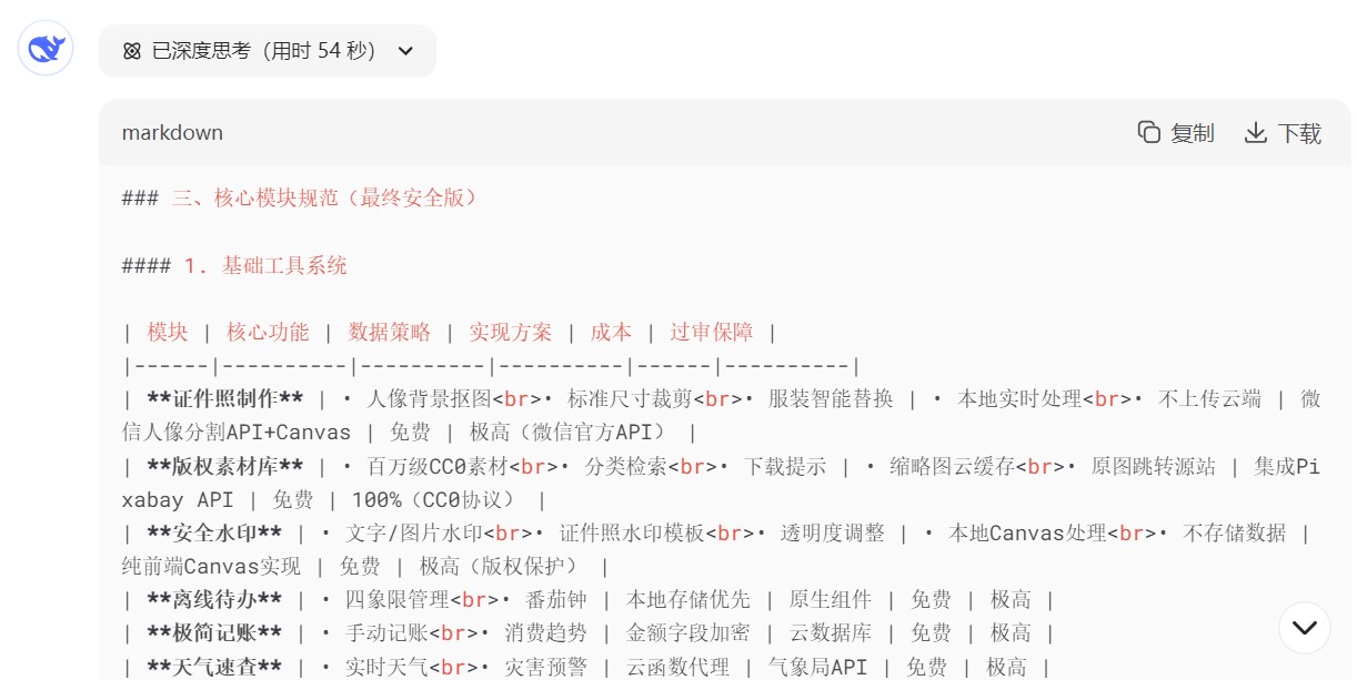 如果自己有idea最好,没有也问题不大,直接问deepseek或CodeBuddy生成开发需求。我就是直接让deepseek帮我生成工具类小程序常见的功能模块,并整理为markdown,如果不满意可以让它继续生成,然后从中选择自己需要的即可。