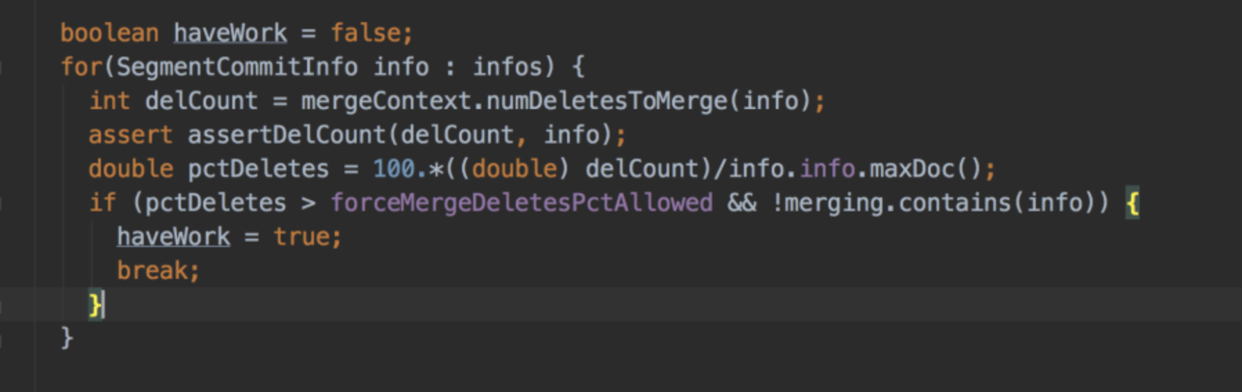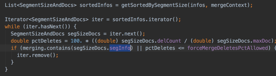 2) segment大小大于maxMergedSegmentBytes/2(maxMergedSegmentBytes默认5g)且segment中删除文档的比例较低的segment(segDelPct <=deletesPctAllowed)