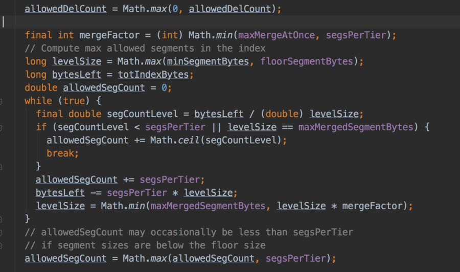 2、计算触发merge条件的segment数(allowedSegCount),如果实际待merge的segment数小于该值则不会触发合并。具体算法: