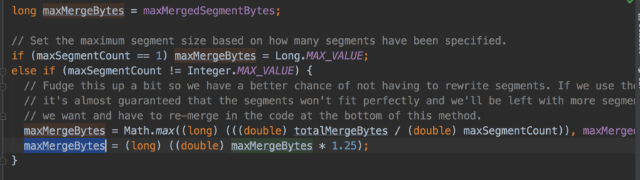 2、计算合并后的单个segment大小上限(maxMergeBytes)。可以看到当指定只合并成1个segment时,maxMergeBytes基本是接近无限大的。**