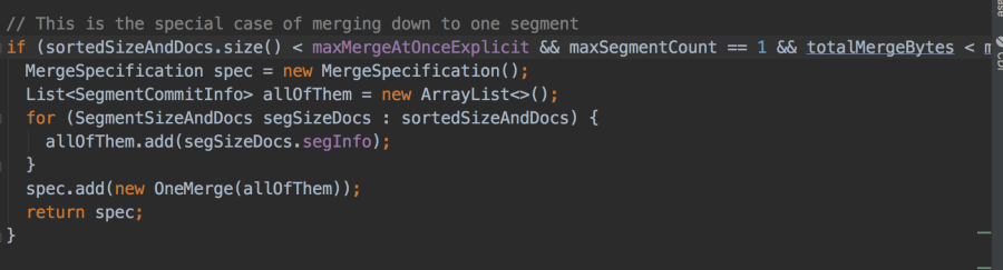 注意:这里没有剔除大于maxMergedSegmentBytes / 2的segment。这是和常规合并最大的区别。