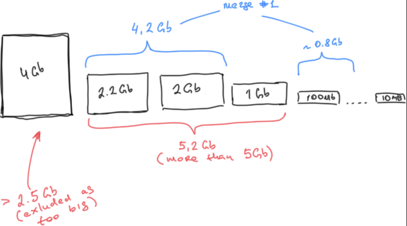 例如: maxMergedSegmentBytes = 5G, 则蓝色是可以合并,红色是不能合并的。如下图:
