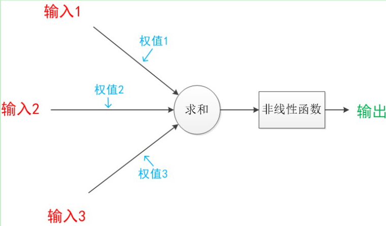 这是一种单层神经网络(我们定义进行计算层的数量来定义神经网络层数,这里计算层只有一个,所有是单层神经网络),设输入为 x1 、 x2 、x3,权值为 w1 、w2 、w3