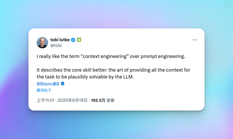 这个概念据说最早是 Shopify 的 CEO, Tobi Lutke 在 X 上提出,此后 Andrej Karpathy 也表示支持,认为相比 提示词工程, 上下文工程 这个说法更贴切。上下文工程是一门微妙的艺术和科学,它为上下文窗口填充下一步所需的正确信息。