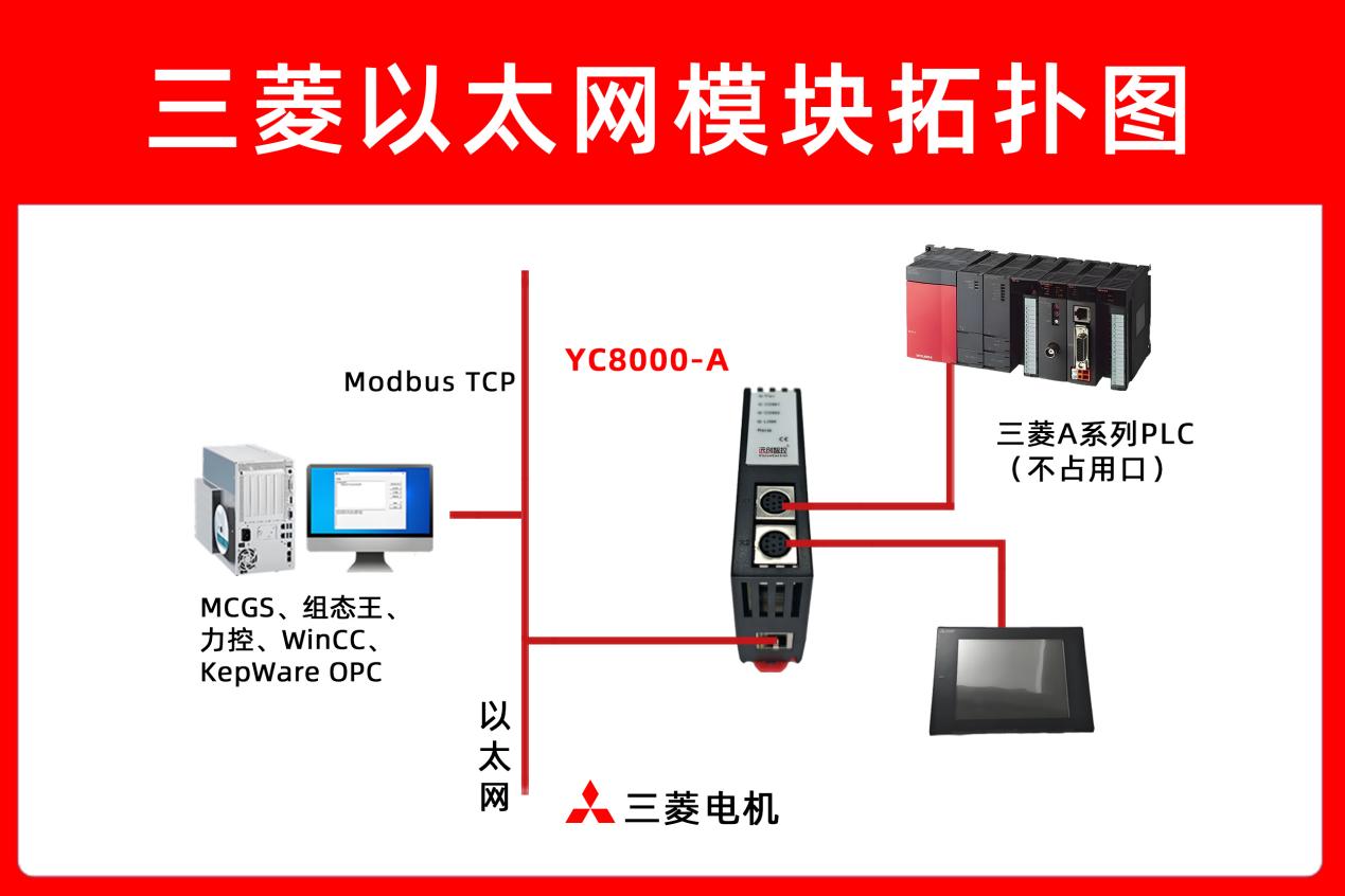 三、解决方案 A公司选择采用远创智控的YC8000-A串口转以太网模块(以太网转换器/以太网桥接器),为三菱A1SJ PLC注入以太网通讯能力,完美解决上述痛点