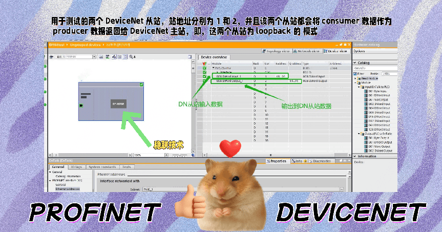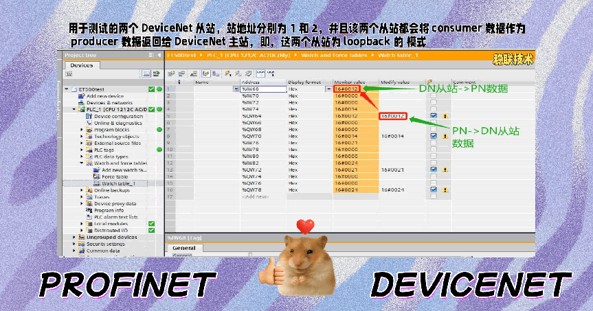 用于测试的两个 DeviceNet 从站,站地址分别为 1 和 2,并且该两个从站都会将 consumer 数据作为 producer 数据返回给 DeviceNet 主站,即,这两个从站为 loopback 的 模式。