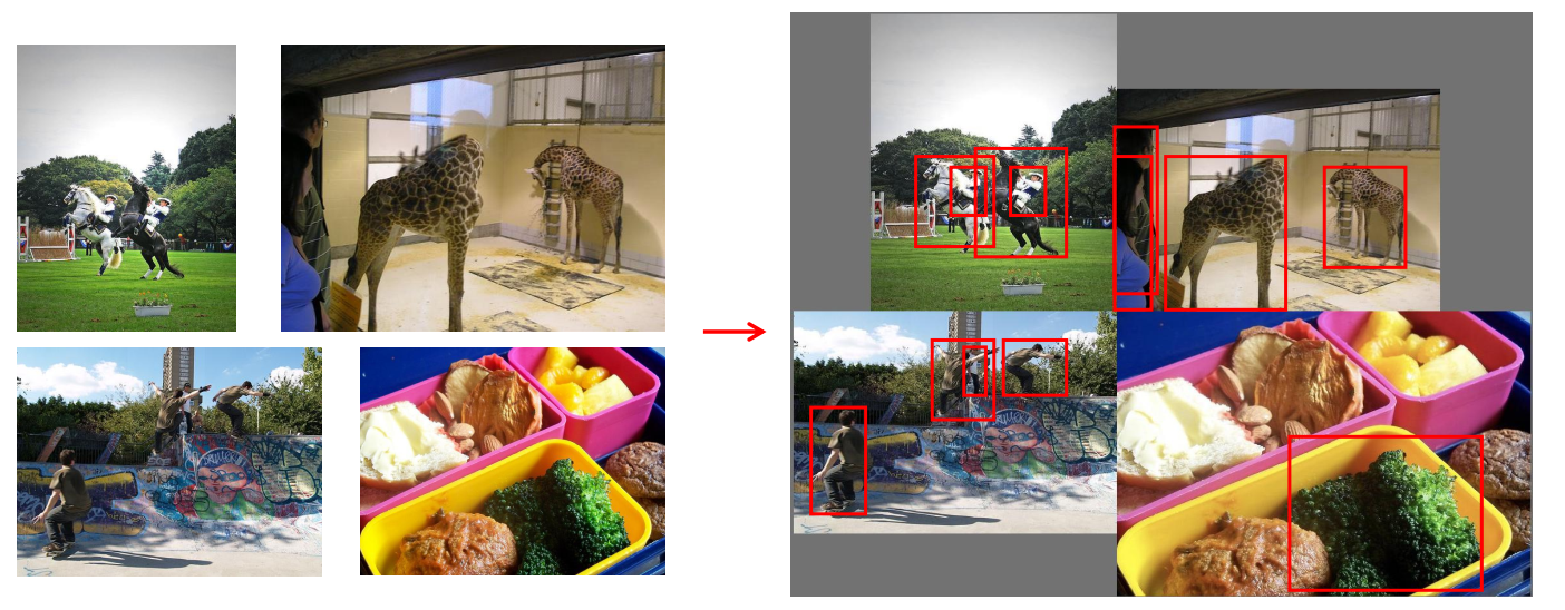 思路:首先,从数据集中随机选择四张图像,然后将它们缩放、随机裁剪,并按马赛克模式拼接在一起。这种方式允许模型看到多尺度的目标,并且增强了目标的背景多样性。