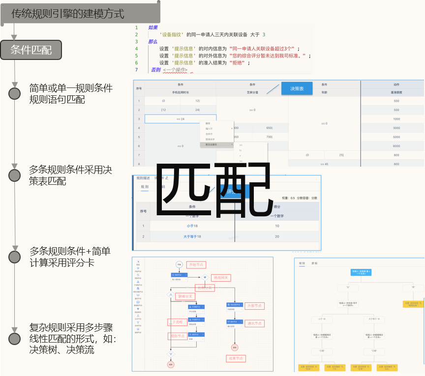 目前市面上主流规则引擎或BRMS决策管理系统产品,功能大都是围绕着规则集以决策表、评分卡、决策树、决策流等形态构建规则逻辑,但不同厂家有各自不同的技术实现和模型规范,厂商间规范不统一通用。