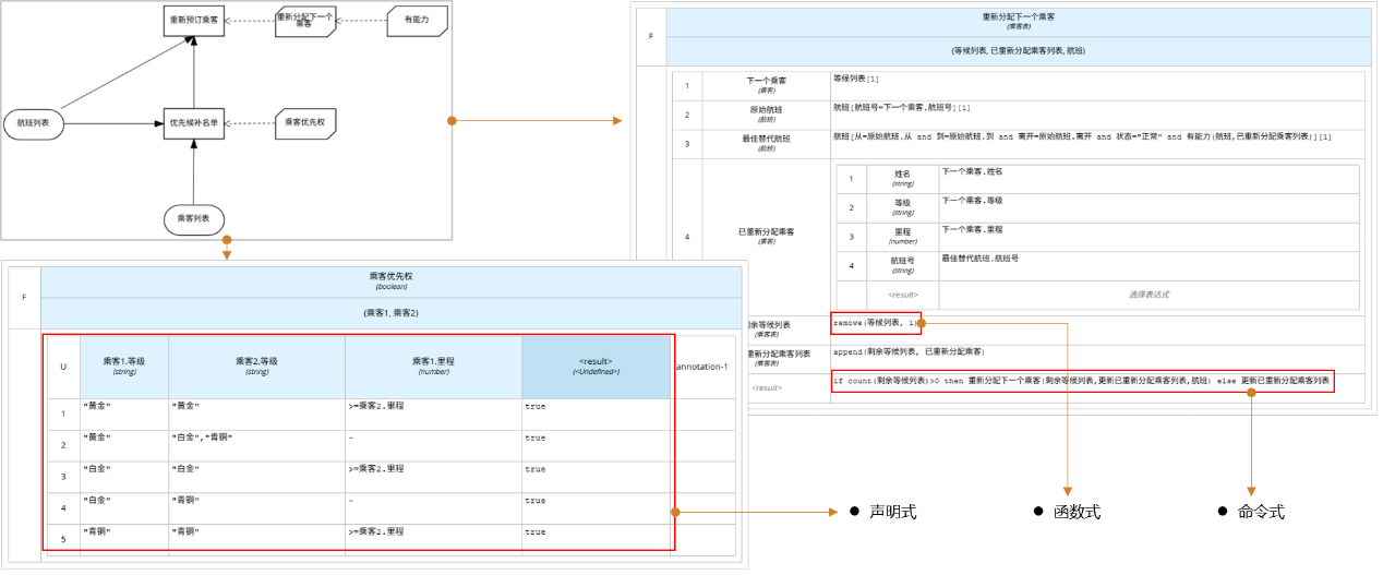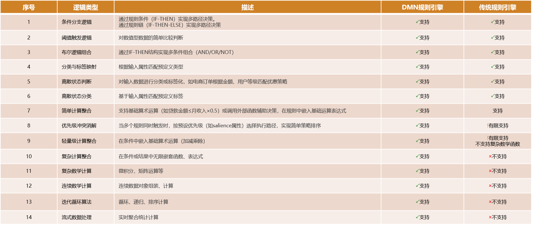 不同于旧有规则引擎“条件+动作”的固有匹配模式,DMN规范重新定义了规则引擎的范式架构,因此DMN规则引擎支持更广泛的逻辑类型,使其拥有了与代码开发等效的逻辑建模能力。