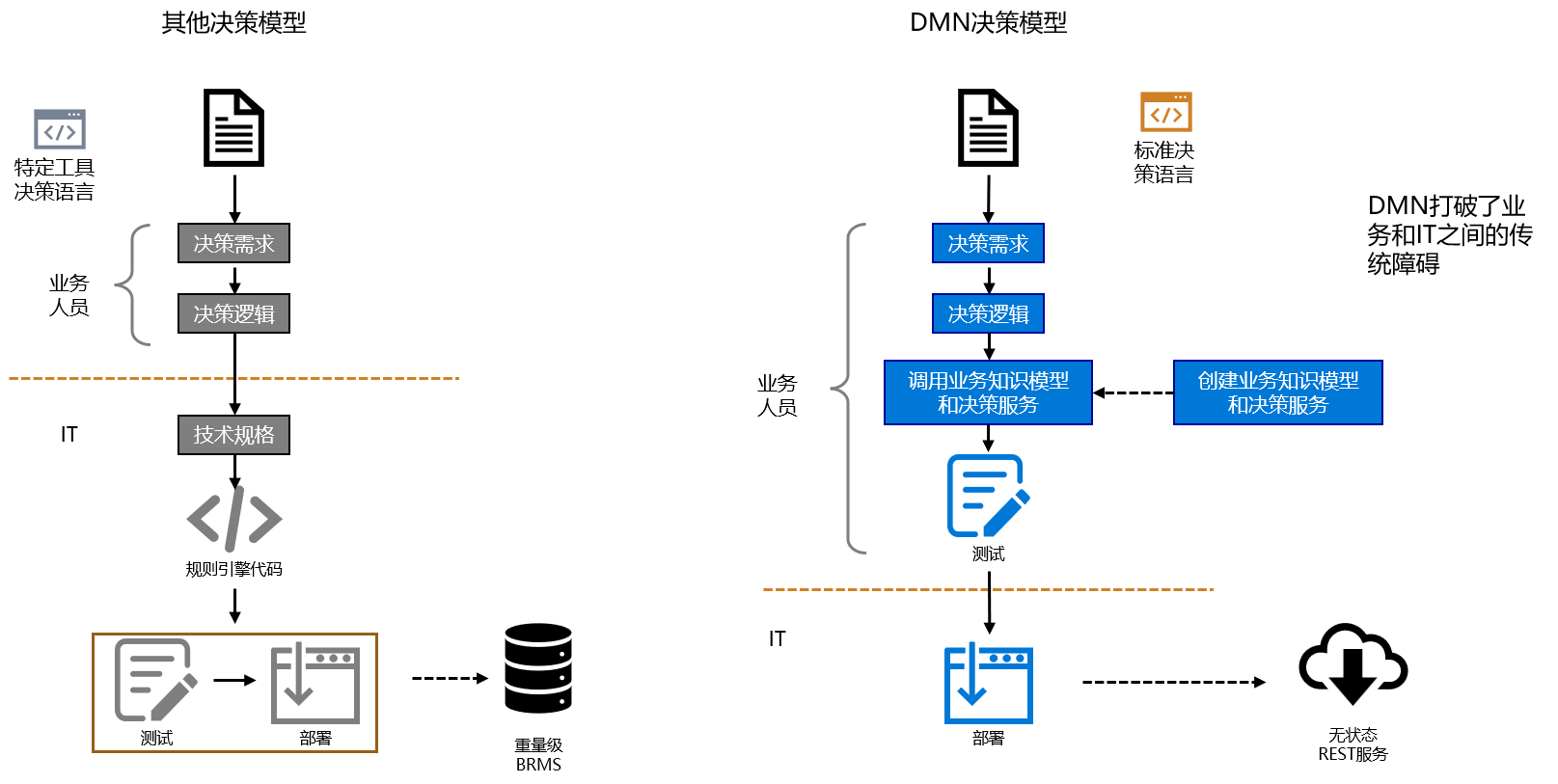 DMN决策建模方式打破了依赖IT资源的模式,使业务管理人员参与成为可能。