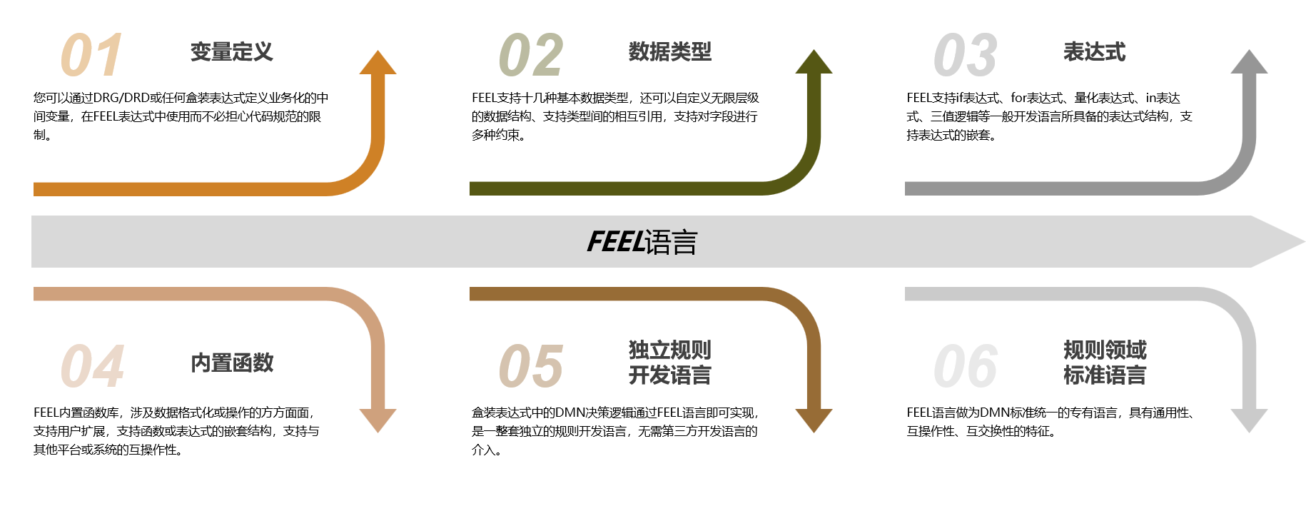 DMN标准统一定义了规则引擎专有FEEL语言,它吸收了主流开发语言的各种优点,表达式非常简单,但实际上是一种功能强大的语言,具有许多内置函数和运算符;它非常适合做对象集合的操作,实现效果与代码开发无异。DMN最强大、最有用的功能之一是它能够在其本身表达式中处理列表和表,因此您无需退回到SQL、Java或流程模型做这些开发。