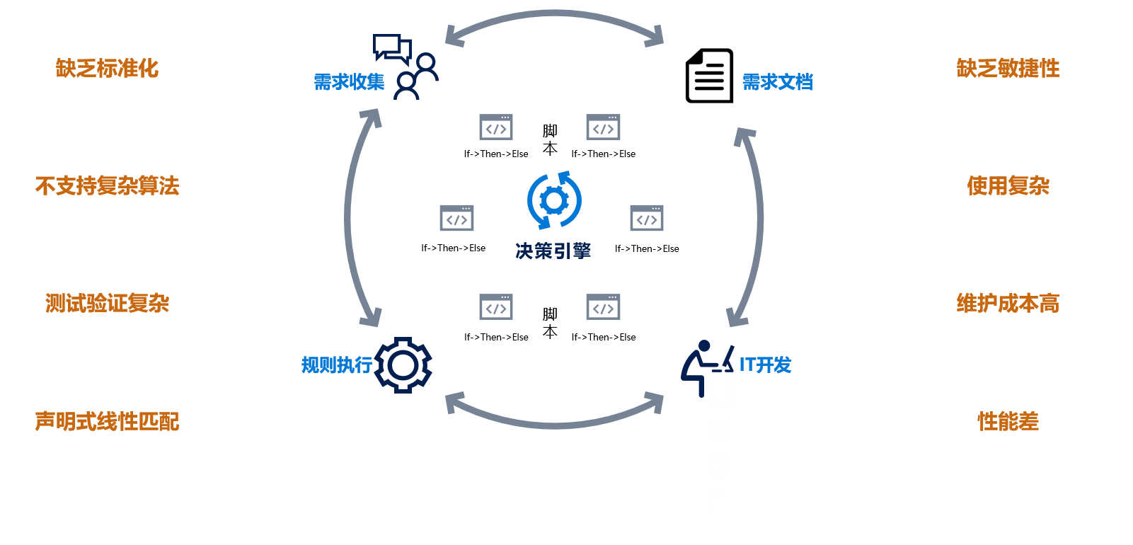 目前市面上厂商推出的各种决策管理系统或规则管理系统还普遍采用触发器操作范例脚本的形式,脚本通常以专有“语言”与决策表一起定义,通常采用 If->Then->Else 风格。当业务规则引擎 (BRE) 发生触发时,将处理这些规则。这些业务规则管理系统 (BRMS) 中用于定义规则、版本、部署、执行、监控和管理规则的工具以及引擎通常捆绑在一起,本质上技术性很强,通常由 IT 资源(即程序员)拥有和维护,业务专家的直接参与非常有限。
